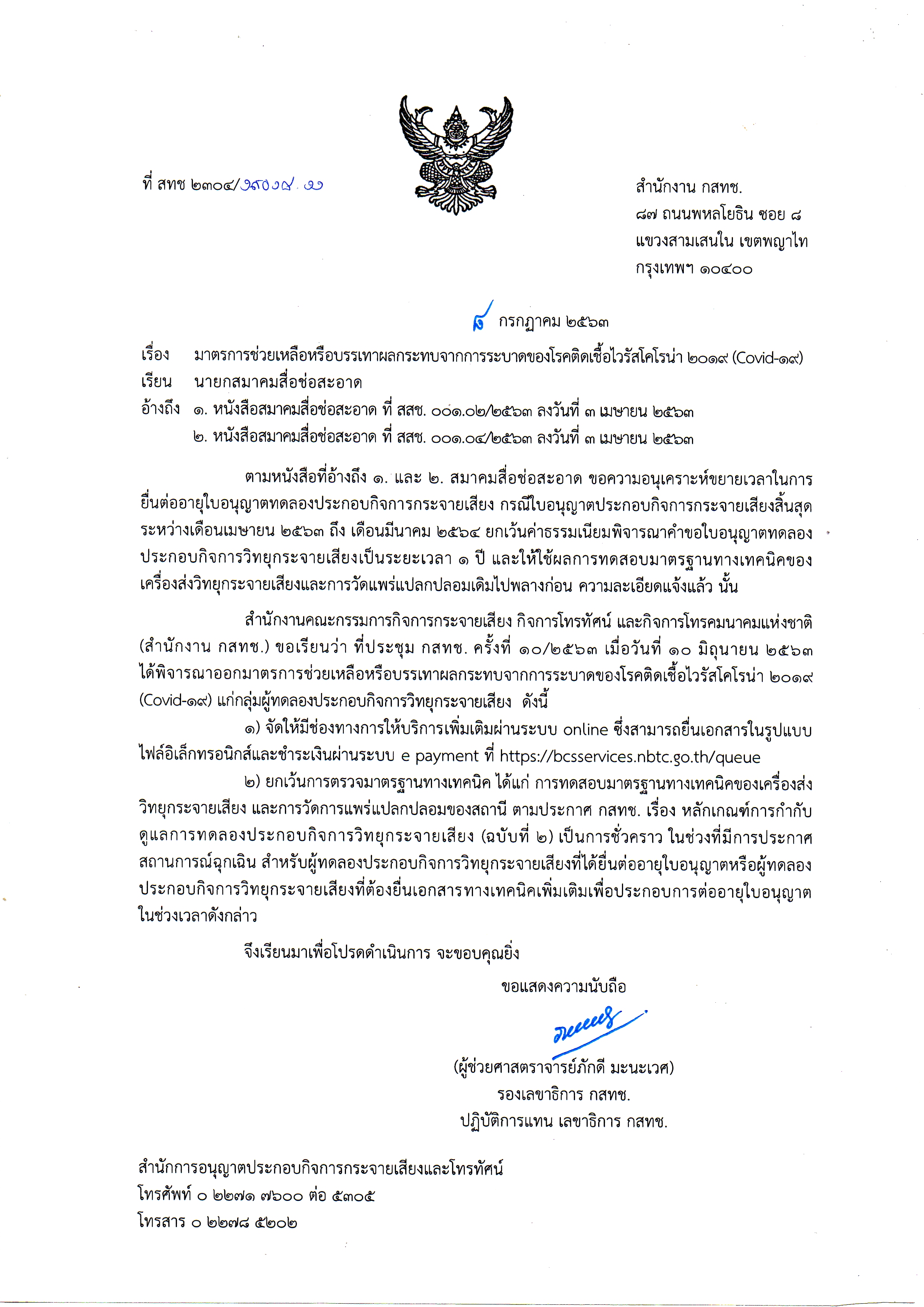 ข้อ 1. ยกเว้นการตรวจมาตรฐานทางเทคนิค ได้แก่ การทดสอบมาตรฐานทางเทคนิคของเครื่องส่งวิทยุกระจายเสียง และการวัดการแพร่แปลกปลอมของสถานี ตามประกาศคณะกรรมการกิจการกระจายเสียง กิจการโทรทัศน์ และกิจการโทรคมนาคมแห่งชาติ เรื่อง หลักเกณฑ์การกำกับดูแลการทดลองประกอบกิจการวิทยุกระจายเสียง พ.ศ. 2556 แก้ไขโดยประกาศคณะกรรมการกิจการกระจายเสียงกิจการโทรทัศน์ และกิจการโทรคมนาคมแห่งชาติ เรื่อง หลักเกณฑ์การกำกับดูแลการทดลองประกอบกิจการวิทยุกระจายเสียง (ฉบับที่ 2) พ.ศ. 2559 สำหรับการต่ออายุใบอนุญาตหรือการยื่นเอกสารทางเทคนิคเพิ่มเติมเพื่อประกอบการต่ออายุใบอนุญาตในช่วงที่มี การประกาศสถานการณ์ฉุกเฉิน โดยการยกเว้นการตรวจมาตรฐานทางเทคนิคตามประกาศนี้ จะสิ้นสุดลงเมื่อมีการแก้ไขหรือยกเลิกกฎหมายหรือคำสั่งที่เกี่ยวข้องกับการจำกัดการเดินทางในราชอาณาจักร