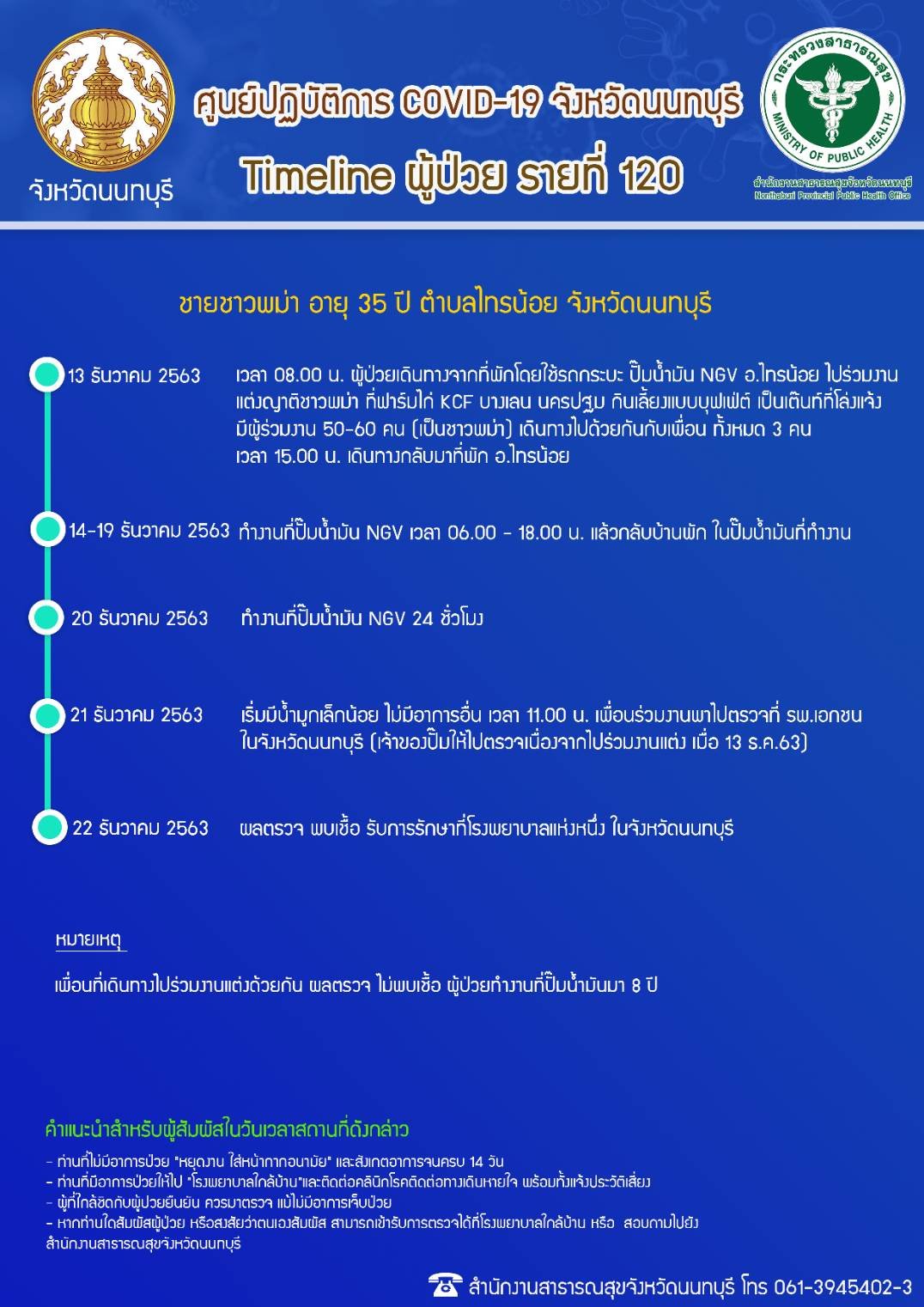 เมื่อวันที่ 22 ธันวาคม 2563 ศูนย์ปฏิบัติการ COVID-19 จังหวัดนนทบุรี โดย สำนักงานสาธารณสุขจังหวัดนนทบุรี เเจ้ง Timeline ผู้ป่วย รายที่ 120 (รายที่ 4 ของการระบาดรอบใหม่) จังหวัดนนทบุรี ผู้ป่วยเป็นชายชาวพม่า อายุ 35 ปี ที่อยู่ อำเภอไทรน้อย จังหวัดนนทบุรี ผู้สัมผัสใกล้ชิด (High Risk) อยู่ระหว่างการติดตามโดย สสอ.ไทรน้อย
