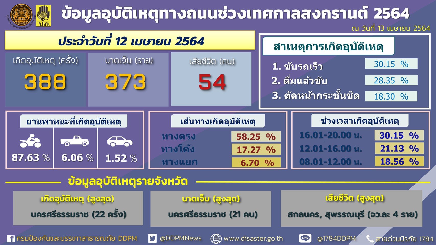วันที่ 13 เมษายน 2564 เวลา 10.30 น. ที่กรมป้องกันและบรรเทาสาธารณภัย ศูนย์อำนวยการป้องกันและลดอุบัติเหตุทางถนนช่วงเทศกาลสงกรานต์ พ.ศ.2564 นายอรรษิษฐ์ สัมพันธรัตน์ รองปลัดกระทรวงมหาดไทย ในฐานะประธานคณะอนุกรรมการเฉพาะกิจศูนย์อำนวยการป้องกันและลดอุบัติเหตุทางถนนตลอดทั้งปี เปิดเผยว่า ศูนย์อำนวยการป้องกันและลดอุบัติเหตุทางถนนช่วงเทศกาลสงกรานต์ พ.ศ. 2564 (ศปถ.) โดยกรมป้องกันและบรรเทาสาธารณภัย (ปภ.) ร่วมมือกับหน่วยงานภาคีเครือข่าย ได้รวบรวมสถิติอุบัติเหตุทางถนนประจำวันที่ 12 เมษายน 2564 ซึ่งเป็นวันสามของการรณรงค์ “สงกรานต์สุขใจ ขับขี่ปลอดภัย ห่างไกลโควิด” เกิดอุบัติเหตุ 388 ครั้ง ผู้เสียชีวิต 54 ราย ผู้บาดเจ็บ 373 คน