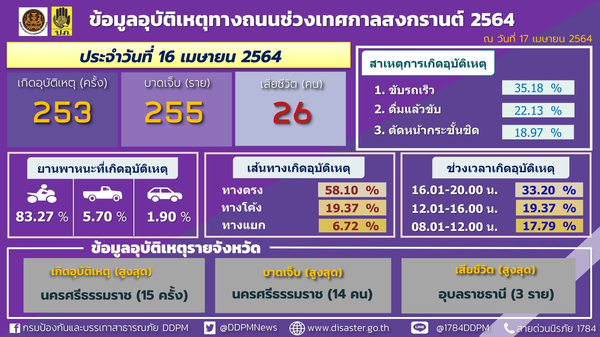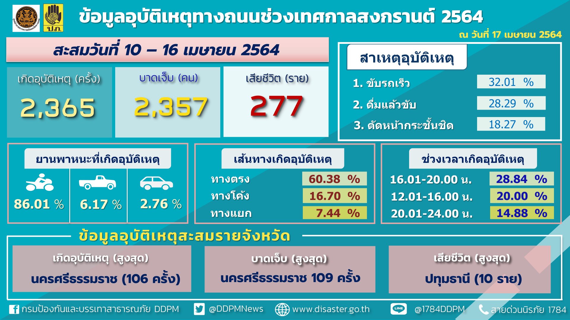 วันที่ 17 เมษายน 2564 เวลา 10.30 น. ที่กรมป้องกันและบรรเทาสาธารณภัย ศูนย์อำนวยการป้องกันและลดอุบัติเหตุทางถนน ช่วงเทศกาลสงกรานต์ พ.ศ.2564 สรุปอุบัติเหตุทางถนนสะสมในช่วง 7 วันของการรณรงค์ (10 - 16 เมษายน 2564) เกิดอุบัติเหตุรวม 2,365 ครั้ง ผู้เสียชีวิตรวม 277 ราย ผู้บาดเจ็บ รวม 2,357 คน จังหวัดที่ไม่มีผู้เสียชีวิต (ตายเป็นศูนย์) มี 5 จังหวัด ประสานจังหวัดตรวจสอบข้อมูลสถิติอุบัติเหตุทางถนนและข้อมูลบูรณาการผู้เสียชีวิตจากอุบัติเหตุทางถนน 3 ฐานให้มีความถูกต้องบนฐานข้อมูลเดียวกัน เพื่อนำมาวิเคราะห์และถอดบทเรียนการดำเนินงานลดอุบัติเหตุทางถนนในเชิงลึก รวมถึงค้นหาปัญหาอุปสรรคและปัจจัยความสำเร็จ เพื่อกำหนดมาตรการป้องกันและลดอุบัติเหตุทางถนนในมิติเชิงพื้นที่ให้สอดคล้องกับทุกปัจจัยเสี่ยงและนำไปสู่การบรรลุเป้าหมายระดับประเทศในการลดอัตราผู้เสียชีวิตจากอุบัติเหตุทางถนน 12 คนต่อประชากรแสนคนภายในปี พ.ศ. 2570