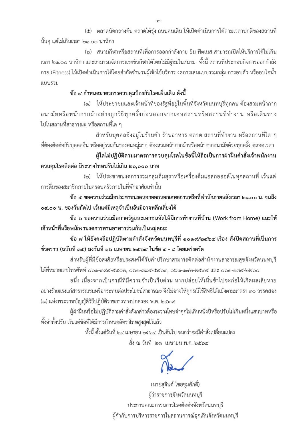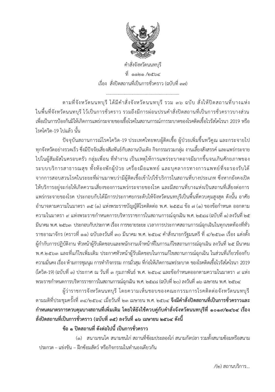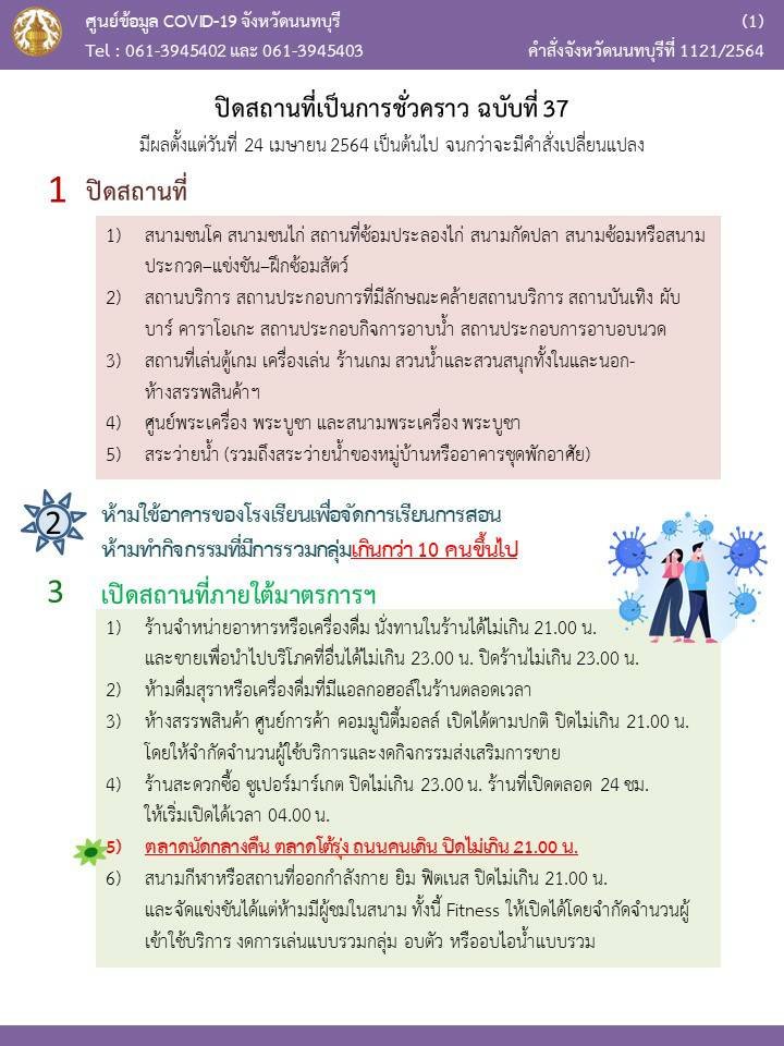 วันที่ 23 เมษายน 2564 นายสุจินต์ ไชยชุมศักดิ์ ผู้ว่าราชการจังหวัดนนทบุรี ในฐานะประธานคณะกรรมการโรคติดต่อจังหวัดนนทบุรี ได้ออกคำสั่งจังหวัดนนทบุรี ที่ 1121/2564 ลงวันที่ 23 เมษายน 2564 เรื่อง สั่งปิดสถานที่เป็นการชั่วคราว (ฉบับที่ 37) โดยจะ มีผลตั้งแต่วันที่ 24 เมษายน 2564 จนกว่าจะมีคำสั่งเปลี่ยนแปลงดังนี้