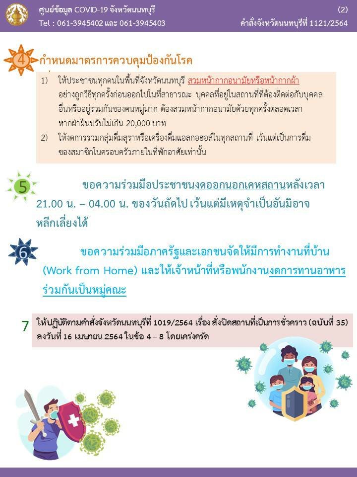 4. กำหนดมาตรการควบคุมป้องกันโรคเพิ่มเติมดังนี้ ให้ประชาชนและเจ้าหน้าที่รัฐที่อยู่ในจังหวัดนนทบุรี ทุกคนต้องสวมใส่หน้ากากอนามัยหรือหน้ากากผ้าอย่างถูกวิธี ทุกครั้งก่อนออกจากเคหะสถานหรือสถานที่ทำงาน หรือเดินทางไปในสถานที่สาธารณะ หรือ สถานที่ใด ๆ สำหรับบุคคลซึ่งอยู่ในร้านค้า ร้านอาหาร ตลาด สถานที่ทำงาน หรือสถานที่ใด ๆ ที่ต้องติดต่อกับบุคคลอื่น ๆ หรืออยู่ร่วมกันของคนหมู่มาก ต้องสวมหน้ากากผ้าหน้ากากอนามัยด้วยทุกครั้ง ตลอดเวลา ผู้ไม่ปฏิบัติตามมาตรการควบคุมโรคในข้อนี้ถือเป็นการฝ่าฝืนคำสั่งเจ้าพนักงานควบคุมโรคติดต่อ มีระวางโทษปรับไม่เกิน 20,000 บาท ให้ประชาชนงดการวมกลุ่มดื่มสุราหรือเครื่องดื่มแอลกอฮอล์ในทุกสถานที่ เว้นแต่การดื่มของสมาชิกภายในครอบครัวที่พักอาศัย
