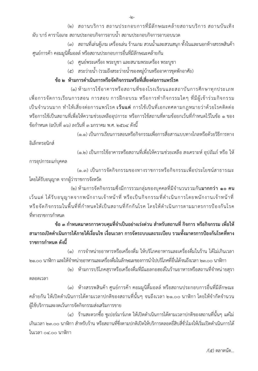 2. ห้ามดำเนินการหรือจัดกิจกรรมที่เสี่ยงต่อการแพร่โรค โดยห้ามการใช้อาคารหรือ สถานที่ของโรงเรียนและสถาบันการศึกษาทุกประเภทเพื่อการจัดการเรียนการสอน การสอบ การฝึกอบรม หรือ การทำกิจกรรมใด ๆ ที่มีผู้ร่วมกิจกรรมเป็นจำนวนมาก ทำให้เสี่ยงต่อการแพร่โรค เว้นแต่ การใช้เป็นเอกเทศตามกฎหมาย ว่าด้วยโรคติดต่อหรือการใช้เป็นสถานที่เพื่อให้ความช่วยเหลืออุปการะ หรือ การใช้สถานที่ตามข้อยกเว้นที่กำหนดไว้ในข้อ 1 ของข้อกำหนด (ฉบับที่16) ลงวันที่ 3 มกราคม 2564 ได้แก่ เป็นการเรียนการสอนหรือกิจกรรมเพื่อการสื่อสารแบบทางไกล หรือ ด้วยวิธีการทางอิเล็กทรอนิกส์ , เป็นการใช้อาคารหรือสถานที่เพื่อให้ความช่วยเหลือ สงเคราะห์ อุปถัมภ์ หรือ ให้การอุปการะแก่บุคคล, เป็นการจัดกิจกรรมของทางราชการหรือกิจกรรมเพื่อประโยชน์สาธารณะ โดยได้รับอนุญาตจากผู้ว่าราชการจังหวัด, ห้ามทำกิจกรรมซึ่งมีการรวมกลุ่มกันมากกว่า 10 คนขึ้นไป เว้นแต่ได้รับอนุญาตจากเจ้าพนักงาน หรือ เป็นกิจกรรมที่ดำเนินการโดยพนักงานเจ้าหน้าที่ หรือ จัดกิจกรรมในพื้นที่ที่กำหนดให้เป็นสถานที่กักกันโรค โดยดำเนินการตามมาตรการป้องกันที่ทางราชการกำหนด