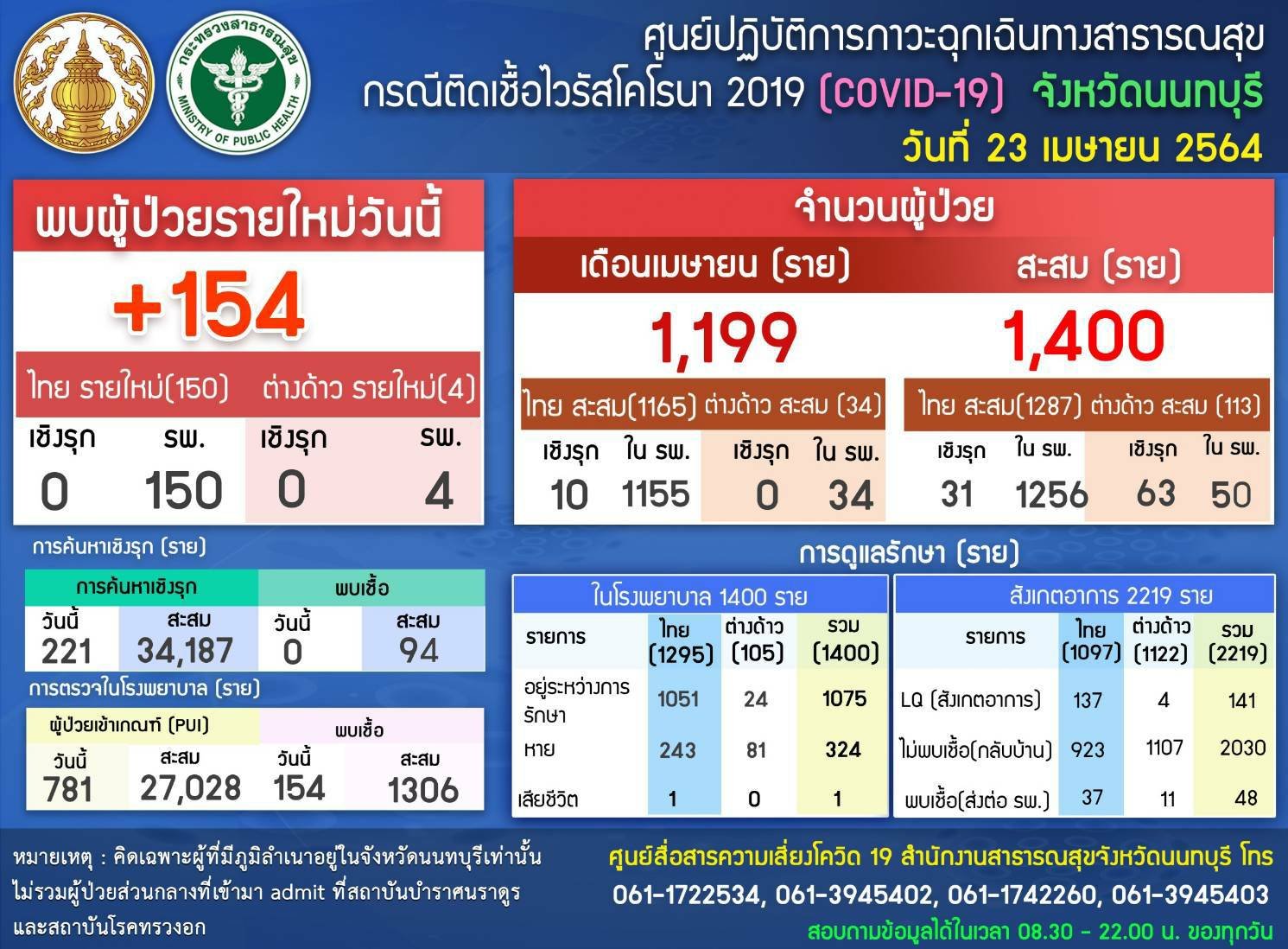 สำหรับสถานการณ์แพร่ระบาดโรคติดเชื้อไวรัสโคโรนา 2019 จังหวัดนนทบุรี วันที่ 23 เมษายน 2564 พบผู้ป่วยยืนยันเพิ่ม 154 ราย ผู้ป่วยยืนยันสะสม รอบใหม่ 1,400 ราย รอบเมษายน 1,199 ราย รักษาหาย 324 ราย อยู่ในโรงพยาบาล 1,075 ราย เสียชีวิตรอบใหม่ 1 ราย
