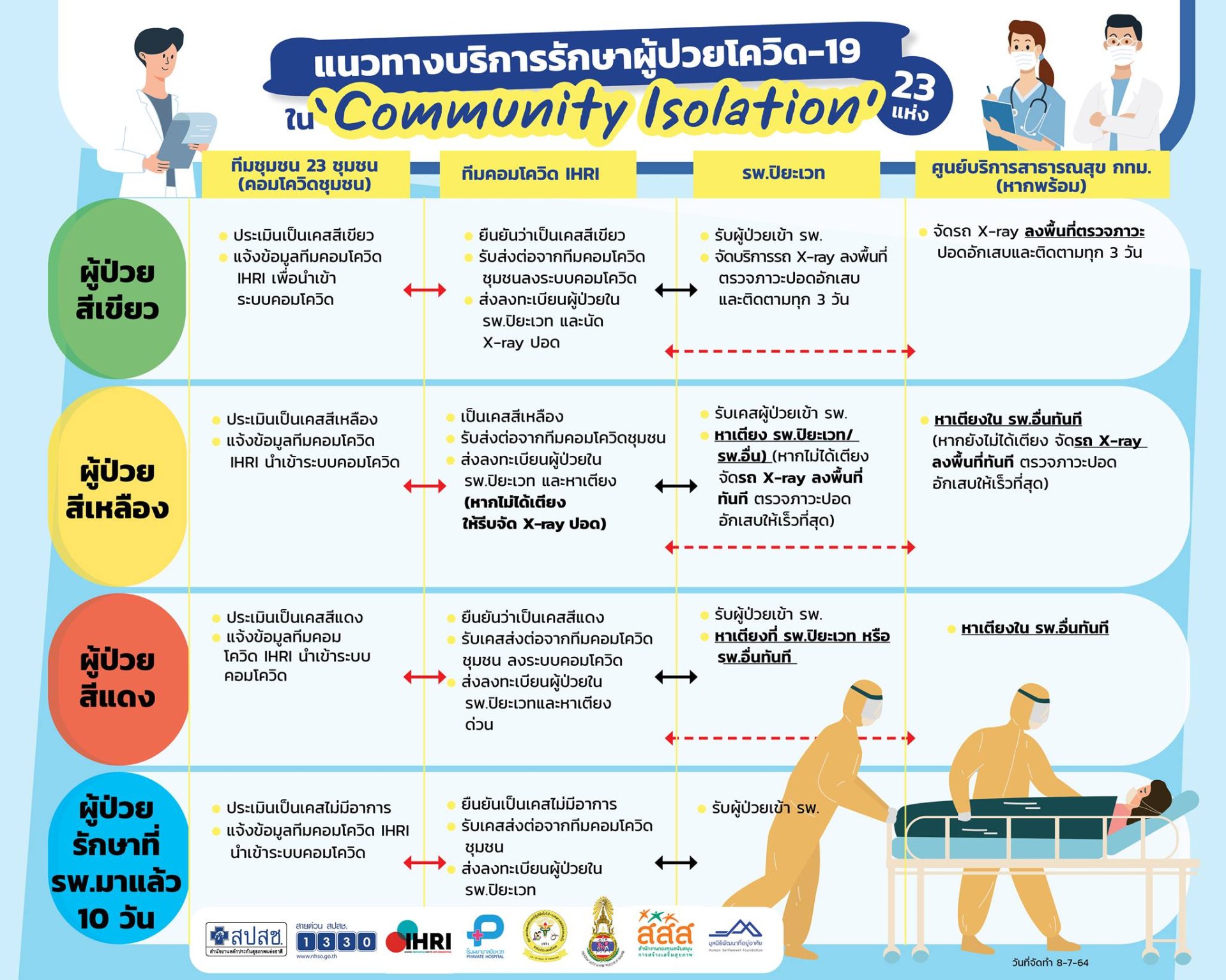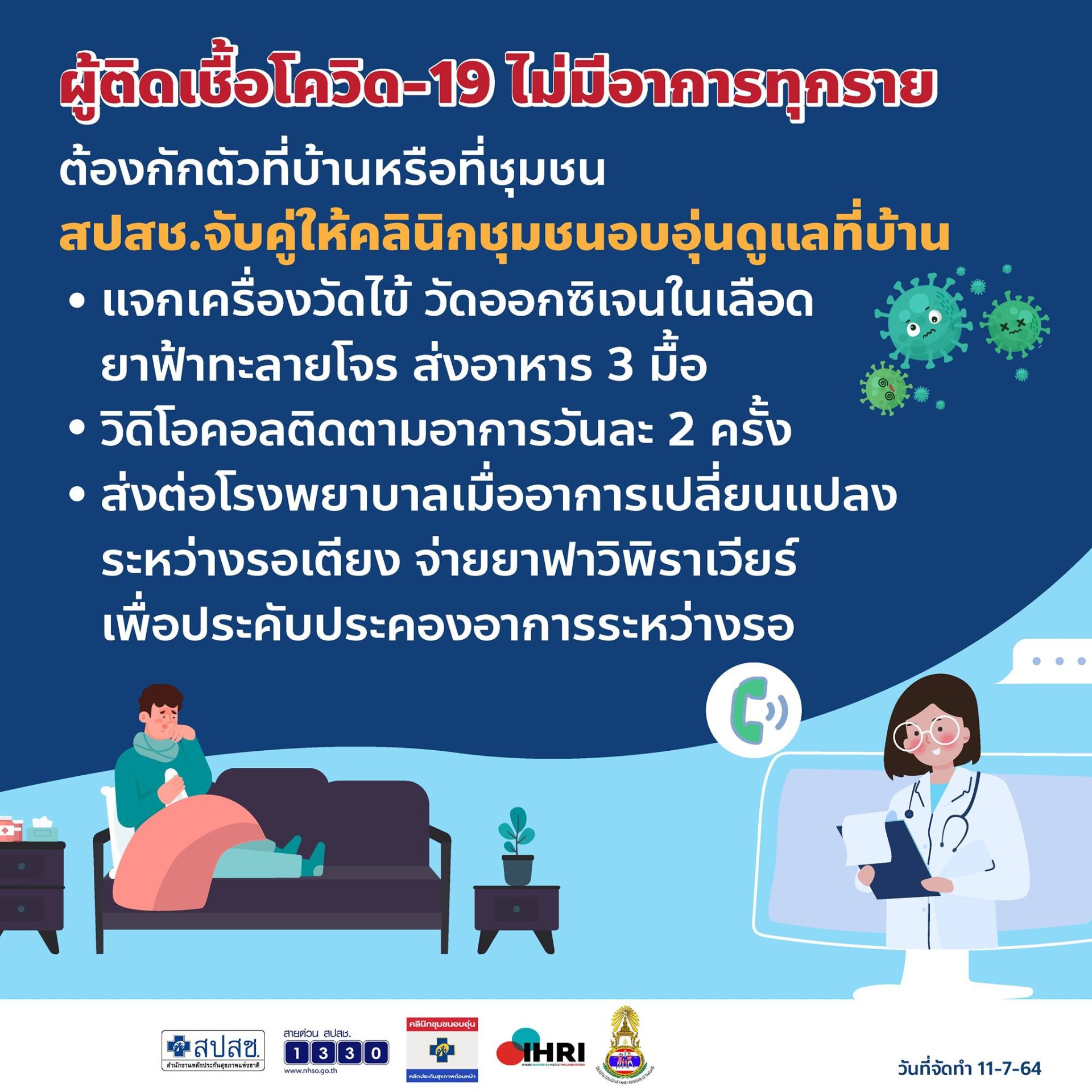 ดังนั้น สปสช.จึงได้ปรับแนวทางการดูแล โดยจากเดิมจะสอบถามความสมัครใจผู้ติดเชื้อกลุ่มสีเขียวซึ่งไม่แสดงอาการหรือแสดงอาการเล็กน้อยก่อน ว่ายินดีเข้าระบบการดูแลรักษาที่บ้าน (Home Isolation) หรือที่ชุมชน (Community Isolation) หรือไม่ แต่ตั้งแต่วันจันทร์ที่ 12 กรกฎาคม 2564 เป็นต้นไป ผู้ป่วยที่ตกค้างรอหาเตียงอยู่ในระบบของ 1330 จะเข้าสู่ระบบการดูแลรักษาที่บ้านทั้งหมด ภายใต้การดูแลของคลินิกชุมชนอบอุ่นในพื้นที่ที่ผู้ป่วยพักอาศัย ซึ่งการดูแลจะเป็นไปตามมาตรฐานของแพทย์เวชศาสตร์ครอบครัว