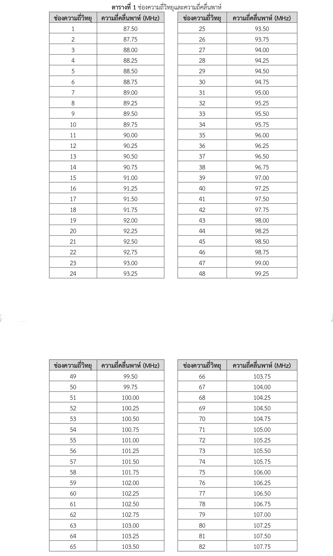 2.2 ช่องความถี่วิทยุ (Frequency Channel) กำหนดให้ใช้ช่องความถี่วิทยุช่องที่ 1 ถึง ช่องที่ 82 ตามตารางที่ 1