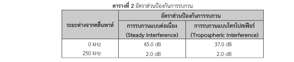 กำหนดให้อัตราส่วนป้องกันการรบกวนเป็นไปตาม Recommendation ITU-R BS.412-9 [2] หรือมาตรฐานอื่นที่เทียบเท่าและตารางที่ 2 ดังนี้