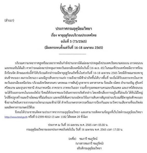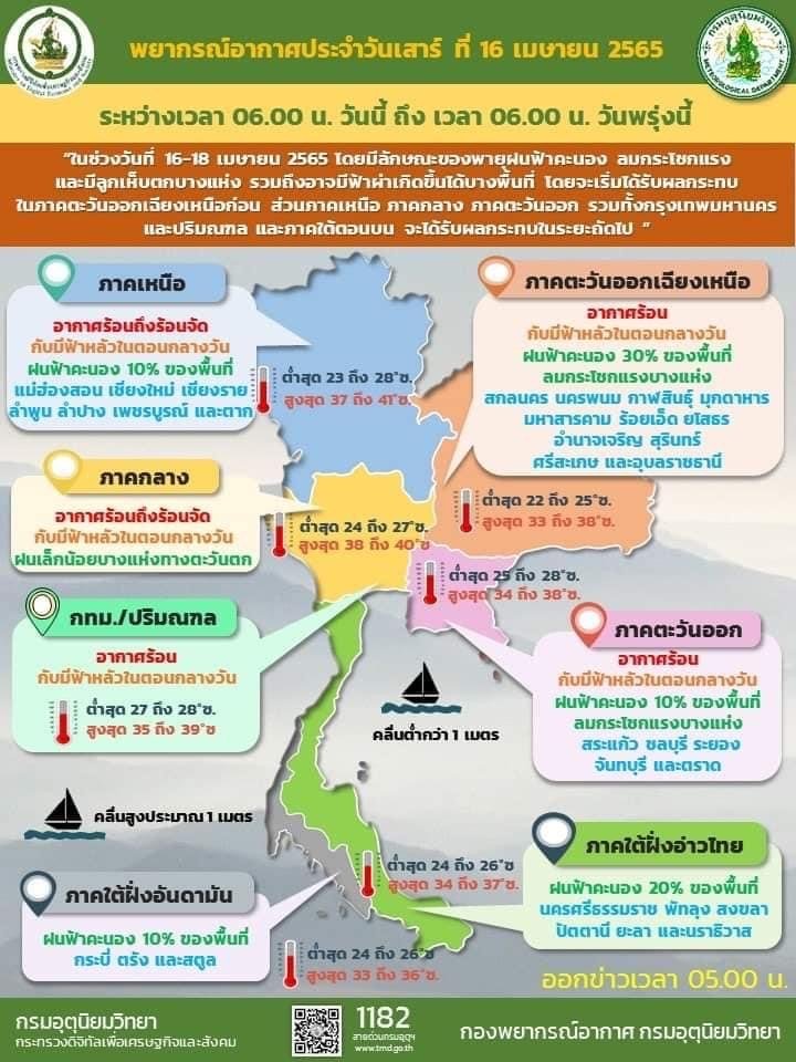 มท.1 กำชับดูแลประชาชน ทยอยเดินทางกลับจากสงกรานต์ พร้อมทั้งแจ้งเตือนประชาชนในพื้นที่เสี่ยงภัยให้ระมัดระวังอันตรายจากพายุฝนฟ้าคะนอง ลมกระโชกแรง ลูกเห็บตก และอันตรายจากฟ้าผ่า ระหว่างวันที่ 16 – 18 เมษายน 2565
