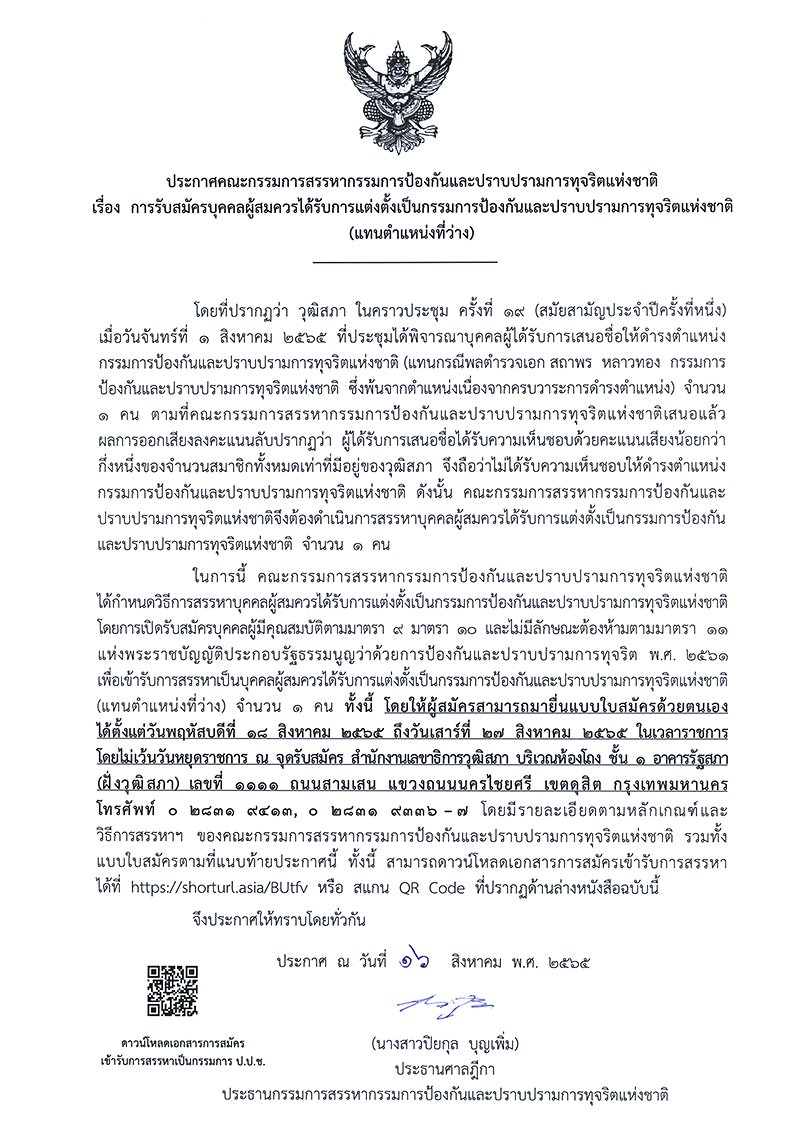 ประกาศรับสมัครกรรมการ ป.ป.ช. จำนวน 1 ตำแหน่ง ระหว่างวันที่ 18-27 สิงหาคม 2565 หลังจากก่อนหน้านี้สรรหามาแล้ว 2 ครั้ง