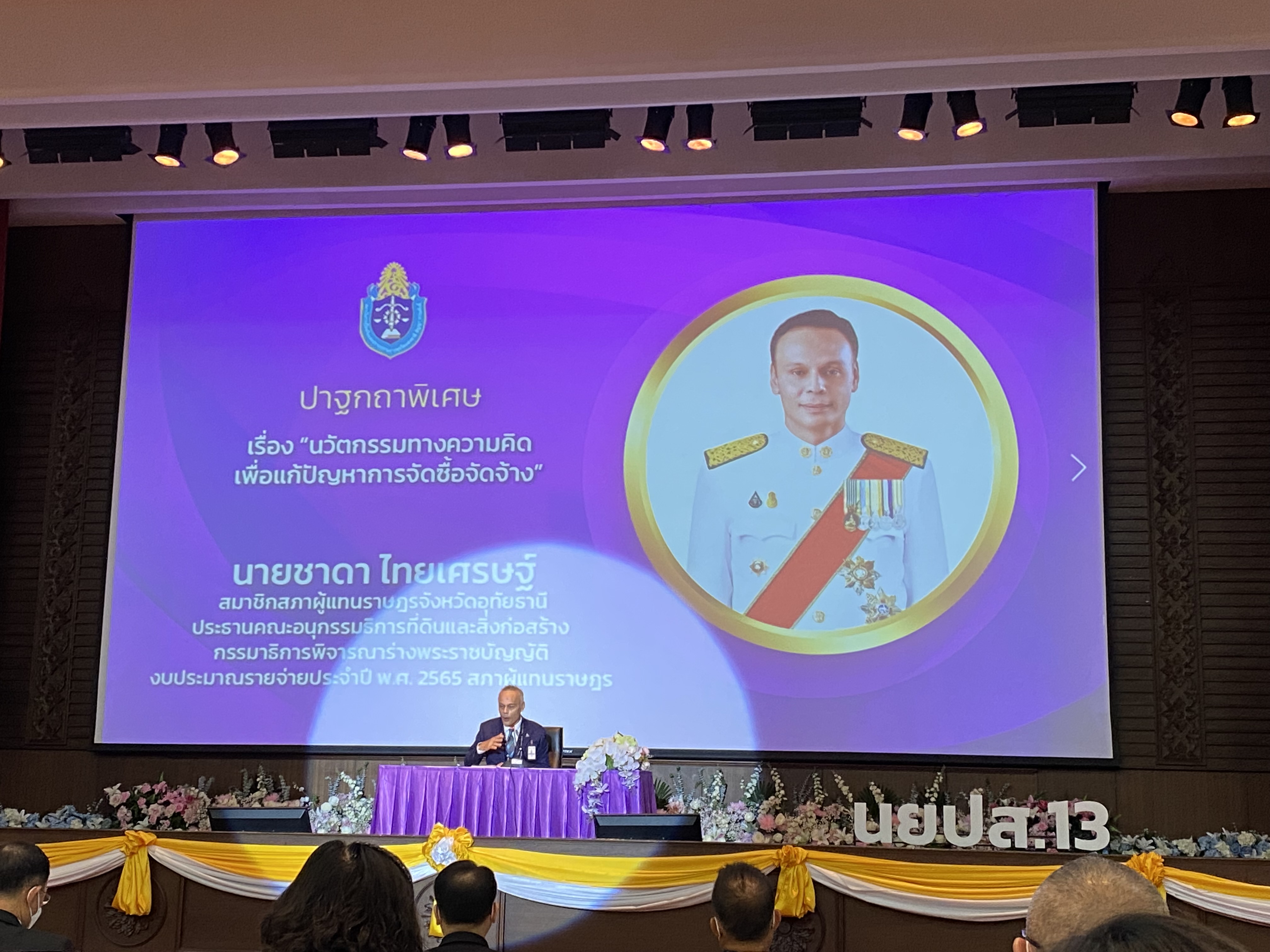 จากนั้น นายชาดา ไทยเศรษฐ์ สมาชิกสภาผู้แทนราษฎร (สส.) จังหวัดอุทัยธานี ในฐานะประธานนักศึกษาหลักสูตร นยปส. รุ่นที่ 13 ปาฐกถาพิเศษ เรื่อง “นวัตกรรมทางความคิดเพื่อแก้ปัญหาการจัดซื้อจัดจ้าง” กล่าวว่าการทุจริตจัดซื้อจัดจ้างภาครัฐมีหลายรูปแบบ และพัฒนาการทุจริต ตั้งแต่การขออนุญาต การออกแบบโครงการรับเหมา การประมูล จึงต้องดูว่าโครงการที่ตั้งขึ้นมามีความเป็นธรรมหรือไม่ และประชาชนได้ประโยชน์หรือไม่ สิ่งสำคัญคือ การออกแบบราคากลาง ที่จะแก้ปัญหาการทุจริตได้ในระดับหนึ่ง รวมถึงควบคุมการล็อกสเปก เพื่อลดปัญหาการฮั้วประมูล ป.ป.ช. จึงต้องสร้างเครือข่ายให้ทุกคนไม่ทนต่อการทุจริตคอร์รัปชันของภาครัฐ