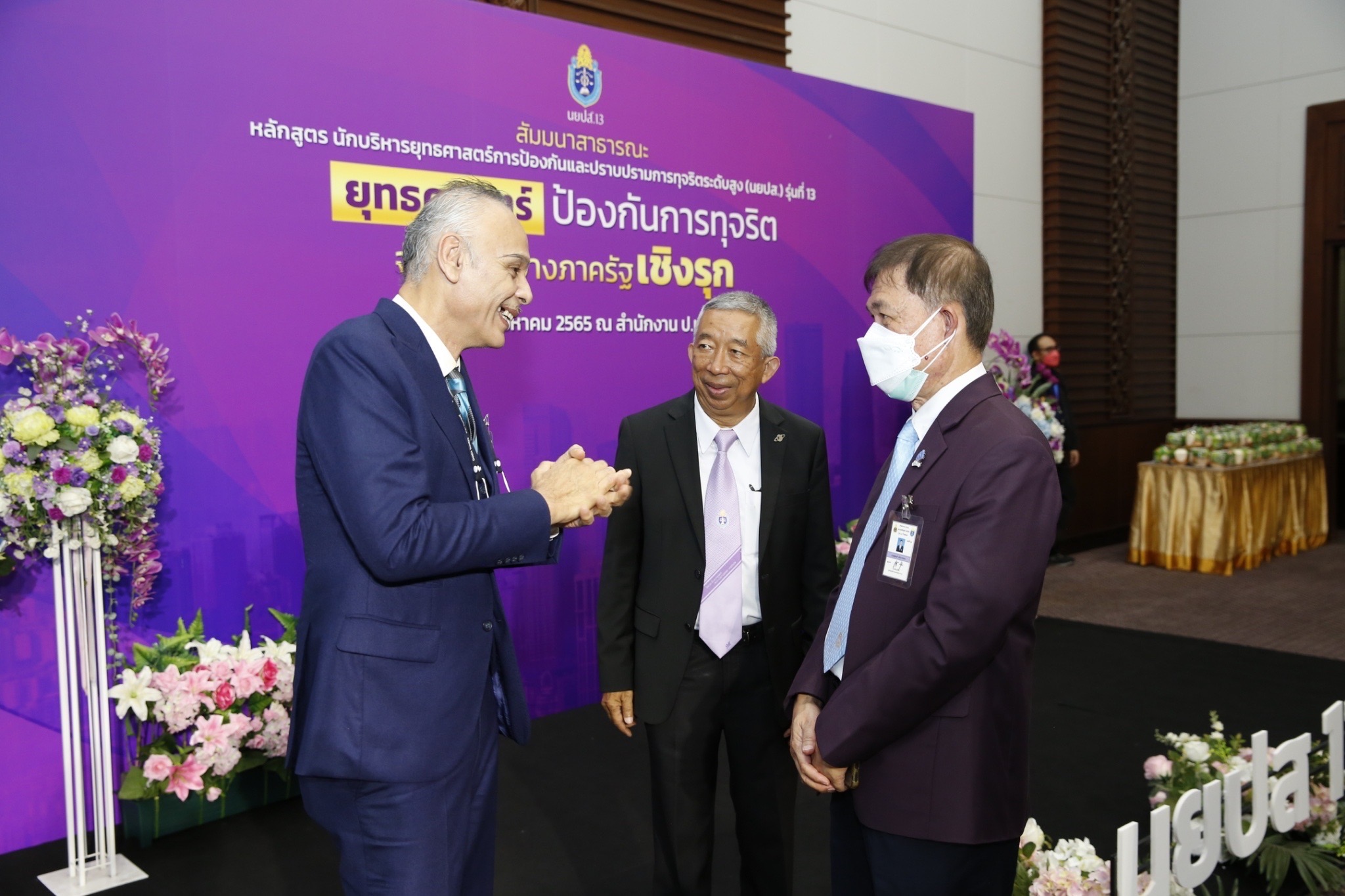 เมื่อวันศุกร์ที่ 19 สิงหาคม 2565 นักศึกษาหลักสูตรนักบริหารยุทธศาสตร์การป้องกันและปราบปรามการทุจริตระดับสูง หรือ “นยปส.” รุ่นที่ 13 จัดสัมมนาสาธารณะ เรื่อง “ยุทธศาสตร์ป้องกันการทุจริตจัดซื้อจัดจ้างภาครัฐเชิงรุก” โดยมี พล.ต.อ.วัชรพล ประสารราชกิจ ประธานคณะกรรมการป้องกันและปราบปรามการทุจริตแห่งชาติ (ป.ป.ช.) กล่าวเปิดงานพร้อมด้วยวิทยากรรับเชิญพิเศษ ประกอบด้วย รองศาสตราจารย์ ดร.ชัชชาติ สิทธิพันธุ์ ผู้ว่าราชการกรุงเทพมหานคร รองศาสตราจารย์ ดร.ธนวรรธน์ พลวิชัย อธิการบดีมหาวิทยาลัยหอการค้าไทย นางสาวลิซ่า งามตระกูลพานิช นายกสมาคมอุตสาหกรรมก่อสร้างไทย ในพระบรมราชูปถัมภ์ นายสมโภชน์ โตรักษา ผู้จัดการฝ่ายข่าวบริษัท กรุงเทพโทรทัศน์และวิทยุ จำกัด โดยมี นางสาวอรวรรณ กริ่มวิรัตน์กุล บริษัท อสมท จำกัด (มหาชน) ณ ห้องประชุมนนทบุรี 1 ชั้น 3 อาคาร 4 สำนักงาน ป.ป.ช. สนามบินน้ำ จังหวัดนนทบุรี
