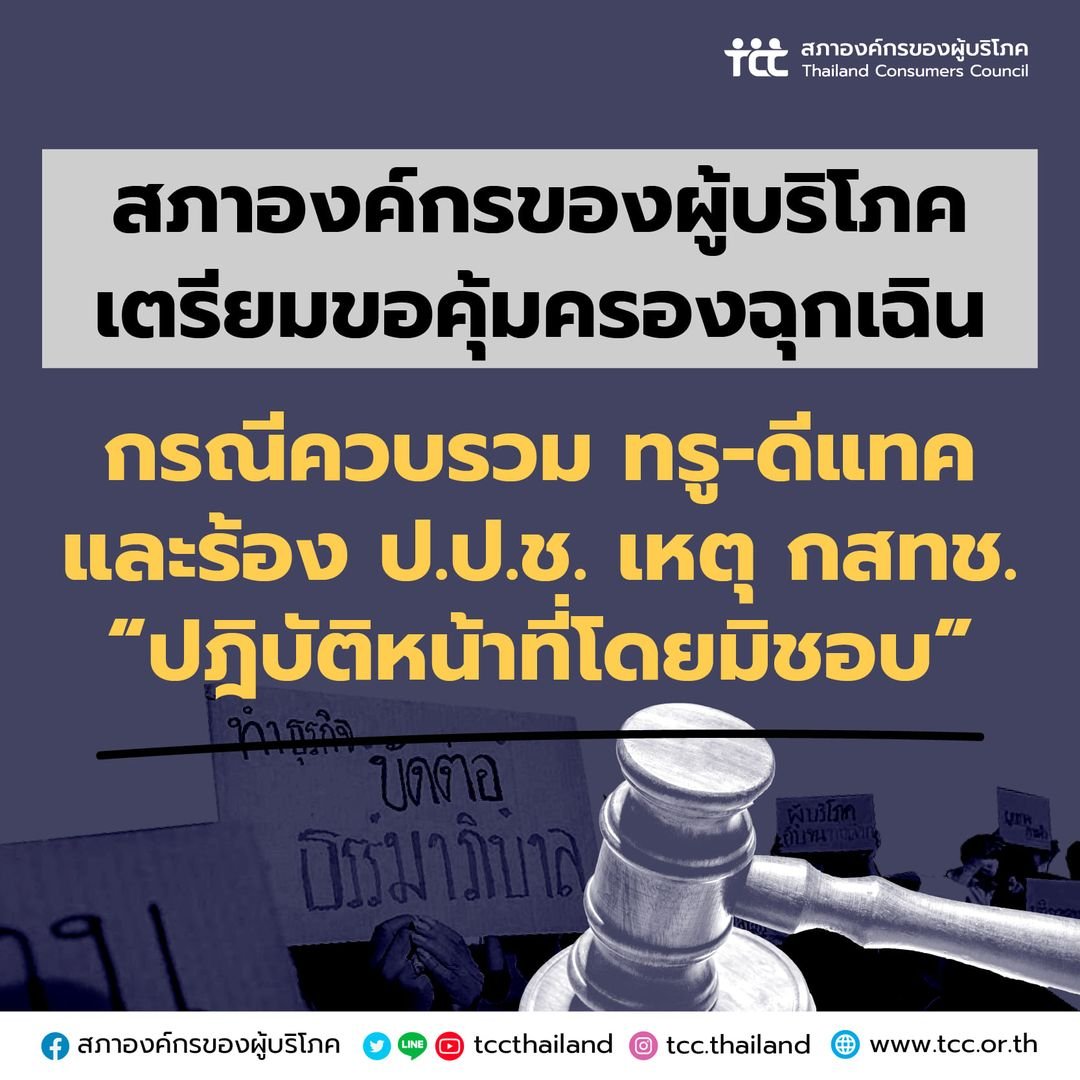 หลังการประชุมของที่ประชุม กสทช.มีมติ 3 ต่อ 2 เสียงรับทราบการควบรวมกิจการระหว่างบริษัท ทรู คอร์ปอเรชั่น จํากัด (มหาชน) และ บริษัท โทเทิ่ล แอ็คเซ็ส คอมมูนิเคชั่น จำกัด (มหาชน) หรือดีแทค แบบมีเงื่อนไข จากนั้น ข้อมูลจากเพจเฟซบุ๊ก สภาองค์กรของผู้บริโภค (สอบ.) เผยแพร่ข้อความระบุว่า สภาองค์กรของผู้บริโภค (สอบ.) แสดงความผิดหวังกับคณะกรรมการกิจการกระจายเสียง กิจการโทรทัศน์ และกิจการโทรคมนาคมแห่งชาติ (กสทช.) ที่ไม่ใช้อำนาจตัวเอง เตรียมขอให้ศาลปกครองไต่สวนฉุกเฉิน และมีคำสั่งคุ้มครองชั่วคราวก่อนมีคำพิพากษา กรณีดังกล่าวพร้อมร้องต่อคณะกรรมการคณะกรรมการป้องกันและปราบปรามการทุจริตแห่งชาติ (ป.ป.ช.) เหตุกรรมการ กสทช. “ปฏิบัติหน้าที่โดยมิชอบ” ในการพิจารณาการควบรวมกิจการประเภทเดียวกันในครั้งนี้ โดยเฉพาะประธาน กสทช. ที่มาจากด้านการคุ้มครองผู้บริโภค ถือว่าน่าผิดหวังเป็นที่สุดสำหรับผู้บริโภค