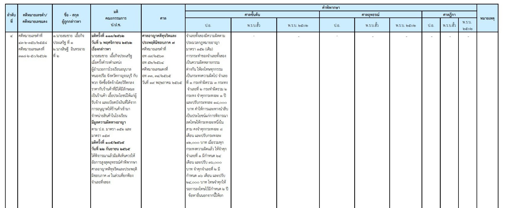นายสมชาย เอื้อกิจประเสริฐ จำเลยที่ 1 กระทำผิดรวม 3 กระทง นางสิษฐี อินทรฉาย จำเลยที่ 2 กระทำผิดรวม 2 กระทง จำคุกกระทงละ 1 ปี และปรับกระทงละ 18,000 บาท