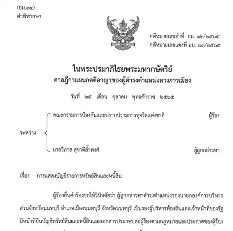 คำพิพากษาศาลฎีกาฯ เพิกถอนสิทธิสมัครรับเลือกตั้งตลอดชีวิต ‘วิภาส สุชาติล้ำพงศ์’ รองนายก อบจ.นนทบุรี ไม่ยื่นบัญชีทรัพย์สินกรณีพ้นตำแหน่ง ป.ป.ช. แจ้งเตือน 4 ครั้งแต่ทำเฉย จําคุก 1 เดือน ปรับ 4,000 บาท รอลงโทษ 1 ปี