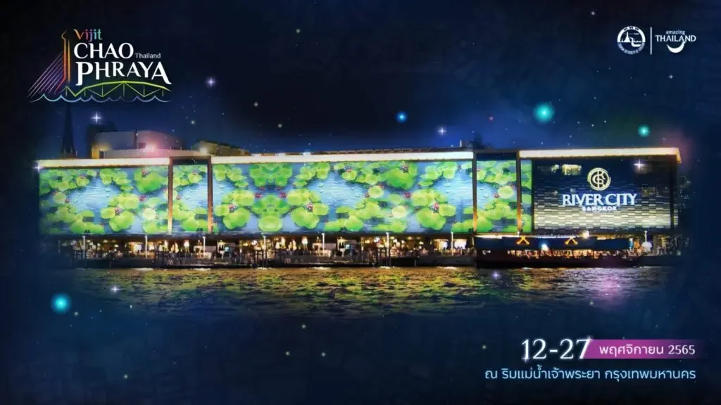 5. ศูนย์การค้าริเวอร์ ซิตี้ แบงค็อก : การฉาย Projection Mapping ไปยังพื้นผิวอาคาร เป็นเสมือนบทสรุปถ่ายทอดเรื่องราวของเสน่ห์แห่งแม่น้ำเจ้าพระยา และนำเสนอ SOFT POWER สำคัญในเมืองไทย เพื่อดึงดูดนักท่องเที่ยวให้เดินทางมาสัมผัสประสบการณ์อันมหัศจรรย์ ทั้งFOOD FILM FASHION FIGHTING FESTIVAL จัดแสดงทุกวัน ๆ ละ 6 รอบ เวลา 19.00 น. 19.30 น. 20.00 น. 20.30 น. 21.00 น. และ 21.30 น.