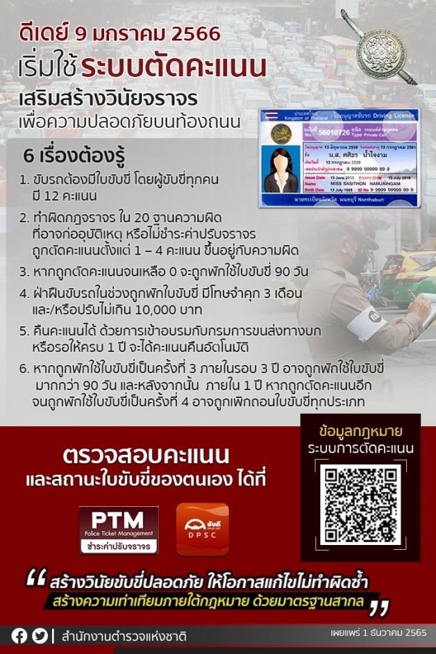 ขณะที่ พล.ต.ต.เอกรักษ์ ลิ้มสังกาศ รองเลขาธิการ ปปง. เน้นย้ำการขับขี่ตามกฎจราจรเพื่อลดอุบัติเหตุ รวมถึงแจ้งเตือนมาตรการบังคับใช้กฎหมาย ภายใต้นโยบายตัดแต้มใบขับขี่ ที่จะเริ่มบังคับใช้ในปี 2566 อย่างเต็มรูปแบบ กล่าวว่า ที่ผ่านมาโทษเกี่ยวกับการผิดกฎหมายจราจร จะมีแต่โทษปรับและบำเพ็ญประโยชน์ ทุกคนจึงคิดว่าไม่รุนแรงและไม่เกรงกลัว เพราะแค่มีเงินจ่ายก็จบ แต่กฎหมายใหม่ภายใต้ระบบตัดคะแนน ไม่ว่ารวยหรือจนทุนคนมี 12 คะแนนต่อปีเท่ากัน คะแนนจะถูกตัดมากน้อยขึ้นแค่ไหน อยู่กับประเภทความผิดที่ผู้ขับขี่ละเมิด