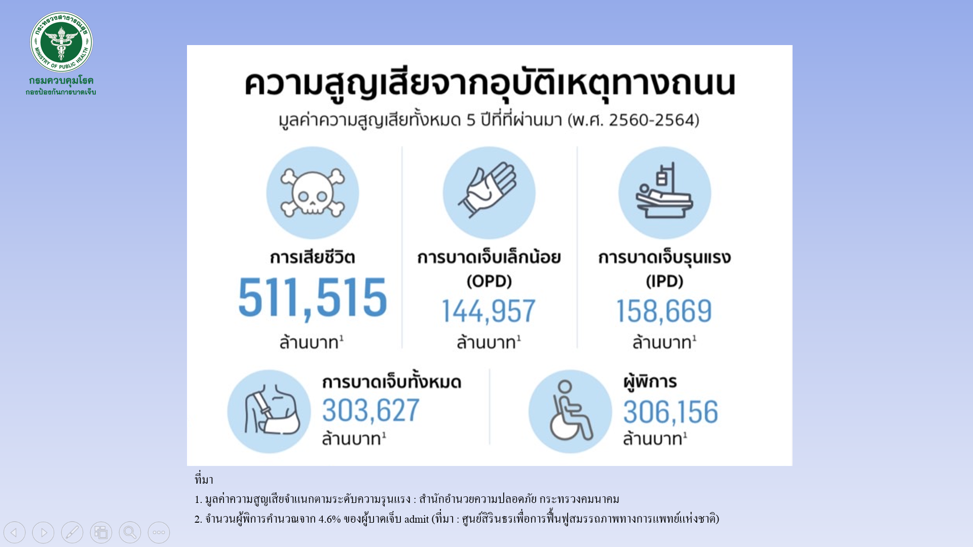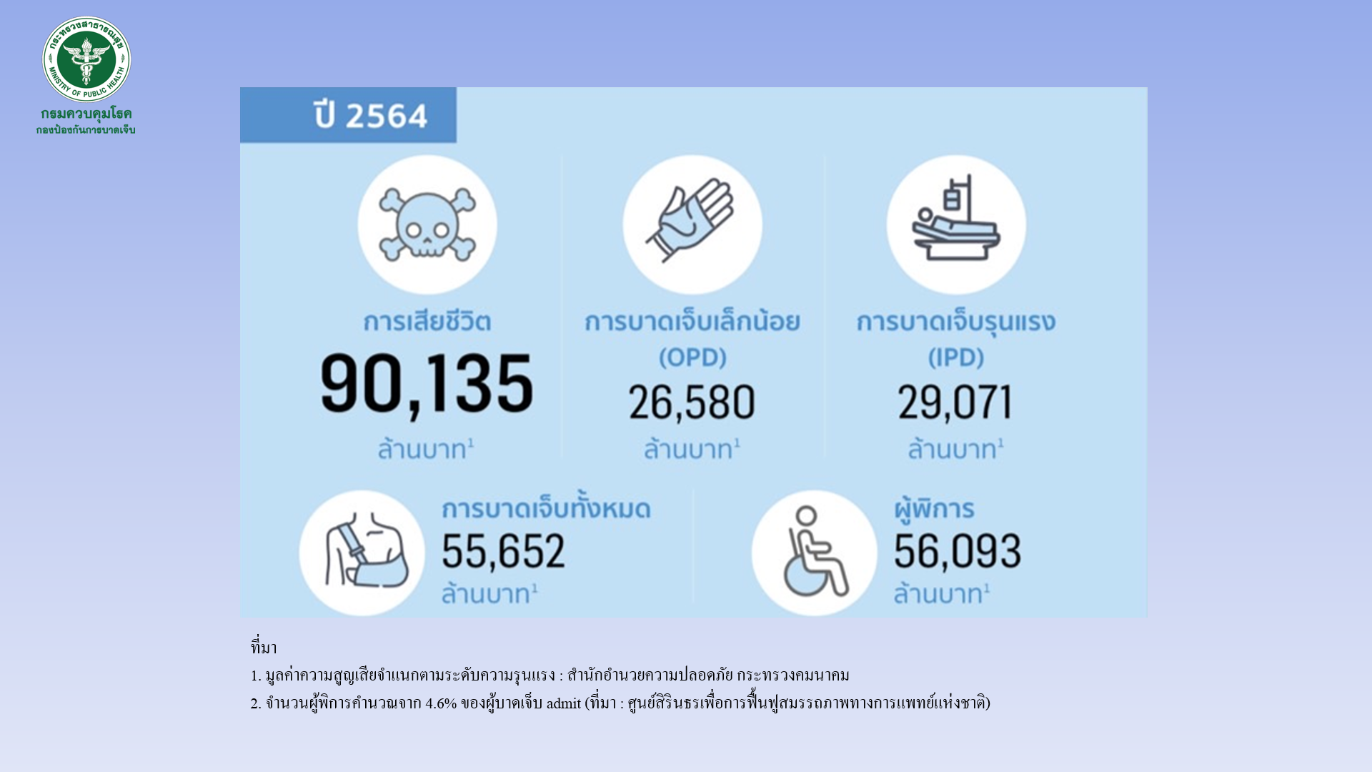 ‘อุบัติเหตุทางถนน’ นอกจากส่งผลกระทบต่อผู้ที่ประสบภัยแล้ว ยังทำให้เกิดความสูญเสียต่อเศรษฐกิจและสังคมไทยโดยรวมอย่างมหาศาล เพราะการเสียชีวิตจากและบาดเจ็บทั้งทางกายและใจจากอุบัติเหตุ ทำให้ผู้ประสบภัยและครอบครัวสูญเสียผลิตภาพ ส่งผลต่อผลิตภาพโดยรวมของประเทศ อีกทั้ง อุบัติเหตุยังก่อให้เกิดต้นทุนอื่นๆ เช่น ต้นทุนในการดำเนินคดี ต้นทุนจากผลกระทบต่อสภาพการจราจร เป็นต้น