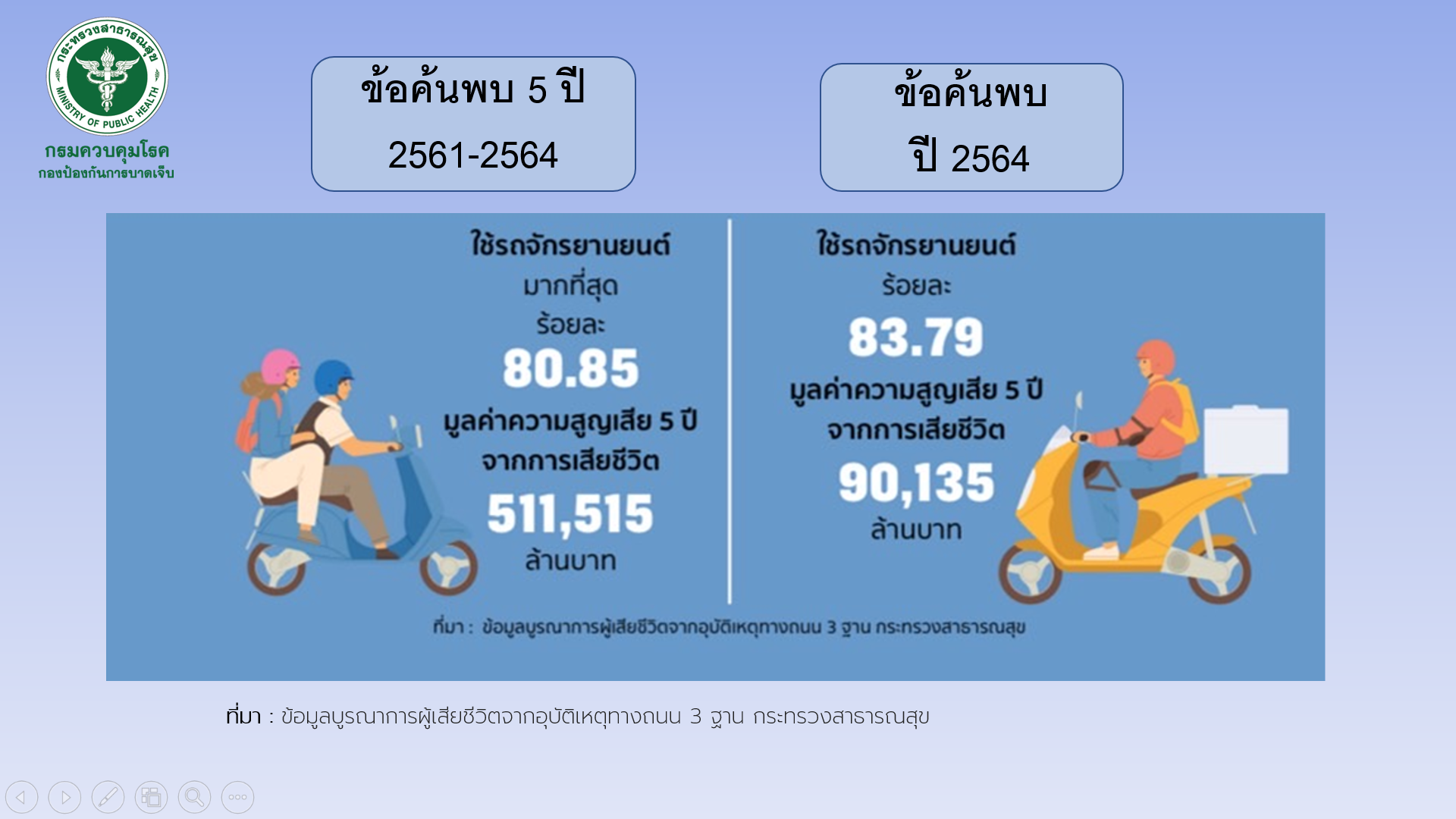 ด้าน พญ.ศิริรัตน์ สุวรรณฤทธิ์ ผู้อำนวยการกองป้องกันการบาดเจ็บ กรมควบคุมโรค กระทรวงสาธารณสุข เผยตัวเลขคาดการณ์ความสูญเสียทางเศรษฐกิจปี 2566 กรณีเกิดผู้พิการรายใหม่จากอุบัติเหตุทางถนน ระบุว่า ในช่วง 5 ปีที่ผ่านมา ข้อมูล 3 ฐานคนไทยเสียชีวิตจากอุบัติเหตุทางถนนรวม 96,230 ราย เฉลี่ยปีละ 19,246 ราย เป็นชายมากกว่าหญิงในสัดส่วน 3.7 ต่อ 1 ส่วนใหญ่อยู่ในช่วงอายุ 15-19 ปี คิดเป็น 11.37% และ 20-24 ปี คิดเป็น 11.05% ในจำนวนนี้ 80% เกิดขึ้นในกลุ่มผู้ขับขี่จักรยานยนต์ ขณะที่ภาพรวมความสูญเสียทางเศรษฐกิจ รวมเฉียดล้านล้านบาท แบ่งตามระดับความรุนแรง ดังนี้