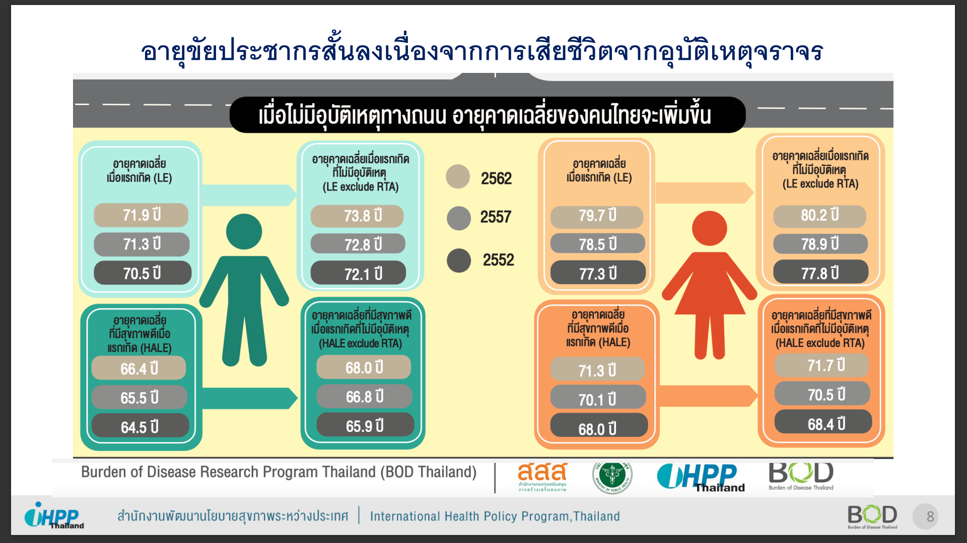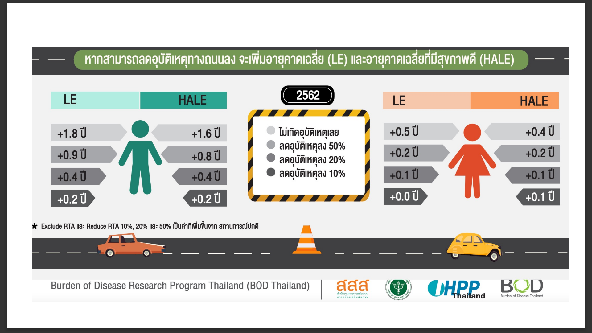 ดร.ภญ.ฐิติพร สุแก้ว นักวิจัยสำนักงานพัฒนานโยบายสุขภาพระหว่างประเทศ (IHPP) จากแผนงานพัฒนาดัชนีภาระโรคแห่งประเทศไทย สำนักงานพัฒนานโยบายสุขภาพระหว่างประเทศ (IHPP) รายงานข้อค้นพบเชิงวิชาการ ‘เพื่อลดการเสียชีวิตลงอย่างรวดเร็วและได้ผล’ ระบุว่า หากประเทศไทยบรรลุเป้าหมาย ลดการเสียชีวิตจากอุบัติเหตุทางถนนลงไปได้ 50% ให้เหลือ 12 รายต่อแสนประชากร ภายในปี 2570 ได้สำเร็จ จะช่วยเพิ่มอายุคาดเฉลี่ย (LE) 0.9 ปี ในกลุ่มประชากรชาย และ 0.2 ปีในกลุ่มประชากรหญิง และเพิ่มอายุคาดเฉลี่ยที่มีสุขภาพดี (HALE) เท่ากับ 0.8 ปีในกลุ่มประชากรชาย และ 0.2 ปีในกลุ่มประชากรหญิง ตรงกันข้ามหากปัญหาอุบัติเหตุไม่ได้รับการแก้ไข จะกระทบต่อการสูญเสียระยะเวลา ที่ประชากรไทยจะมีชีวิตอยู่ และอยู่อย่างมีสุขภาพดี