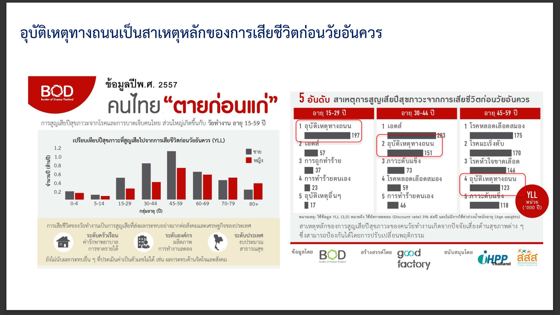 ในช่วง 5 ปีที่ผ่านมา ข้อมูล 3 ฐานคนไทยเสียชีวิตจากอุบัติเหตุทางถนนรวม 96,230 ราย เฉลี่ยปีละ 19,246 ราย เป็นชายมากกว่าหญิงในสัดส่วน 3.7 ต่อ 1 ส่วนใหญ่อยู่ในช่วงอายุ 15-19 ปี คิดเป็น 11.37% และ 20-24 ปี คิดเป็น 11.05% ในจำนวนนี้ 80% เกิดขึ้นในกลุ่มผู้ขับขี่จักรยานยนต์ ขณะที่ภาพรวมความสูญเสียทางเศรษฐกิจ รวมเฉียดล้านล้านบาท