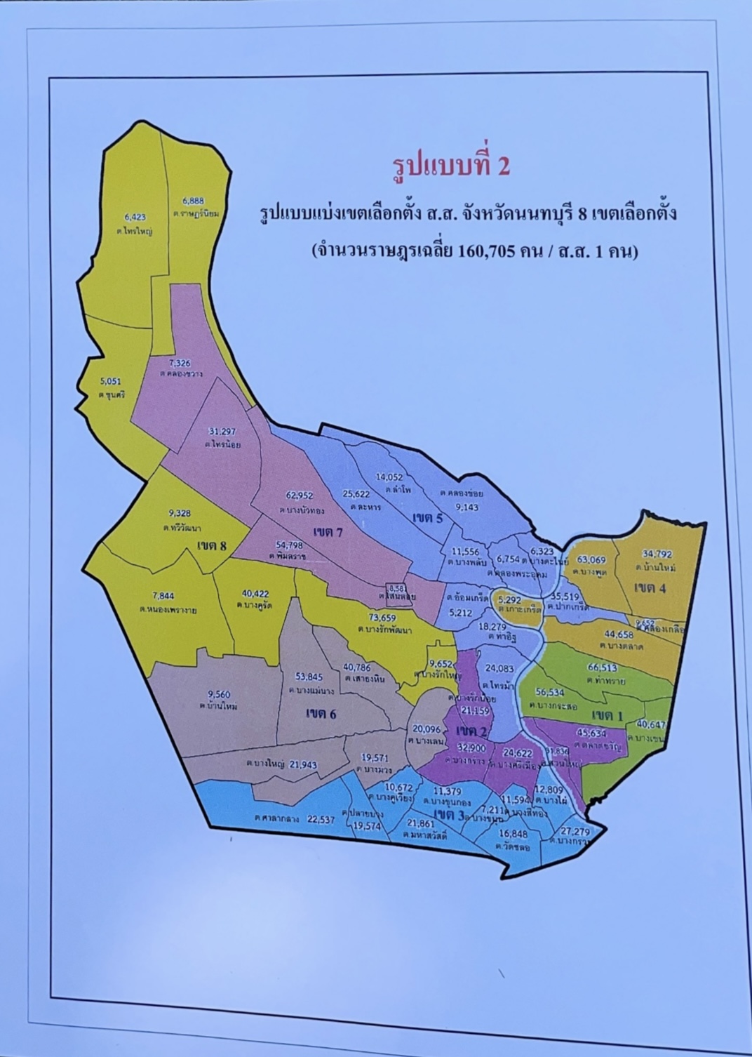 เมื่อวันที่ 3 มีนาคม 2566 ร้อยตำรวจเอก หญิง วฤนธร ตั้งตฤษณกุล ผู้อำนวยการการเลือกตั้งประจำจังหวัดนนทบุรี เปิดเผยว่าสำนักงาน กกต. นนทบุรี ได้ประกาศรูปแบบการแบ่งเขตเลือกตั้ง ส.ส.เพื่อรับฟังความคิดเห็นของพรรคการเมืองและประชาชนในจังหวัดนนทบุรี เป็นเวลา 10 วัน โดยจะเริ่มแสดงความคิดเห็นได้ในวันที่ 4 - 13 มีนาคม 2566 ซึ่งสำนักงานการเลือกตั้งประจำจังหวัดนนทบุรี ได้จัดทำประกาศ แผนที่รูปแบบการแบ่งเขตไว้ 3 รูปแบบ