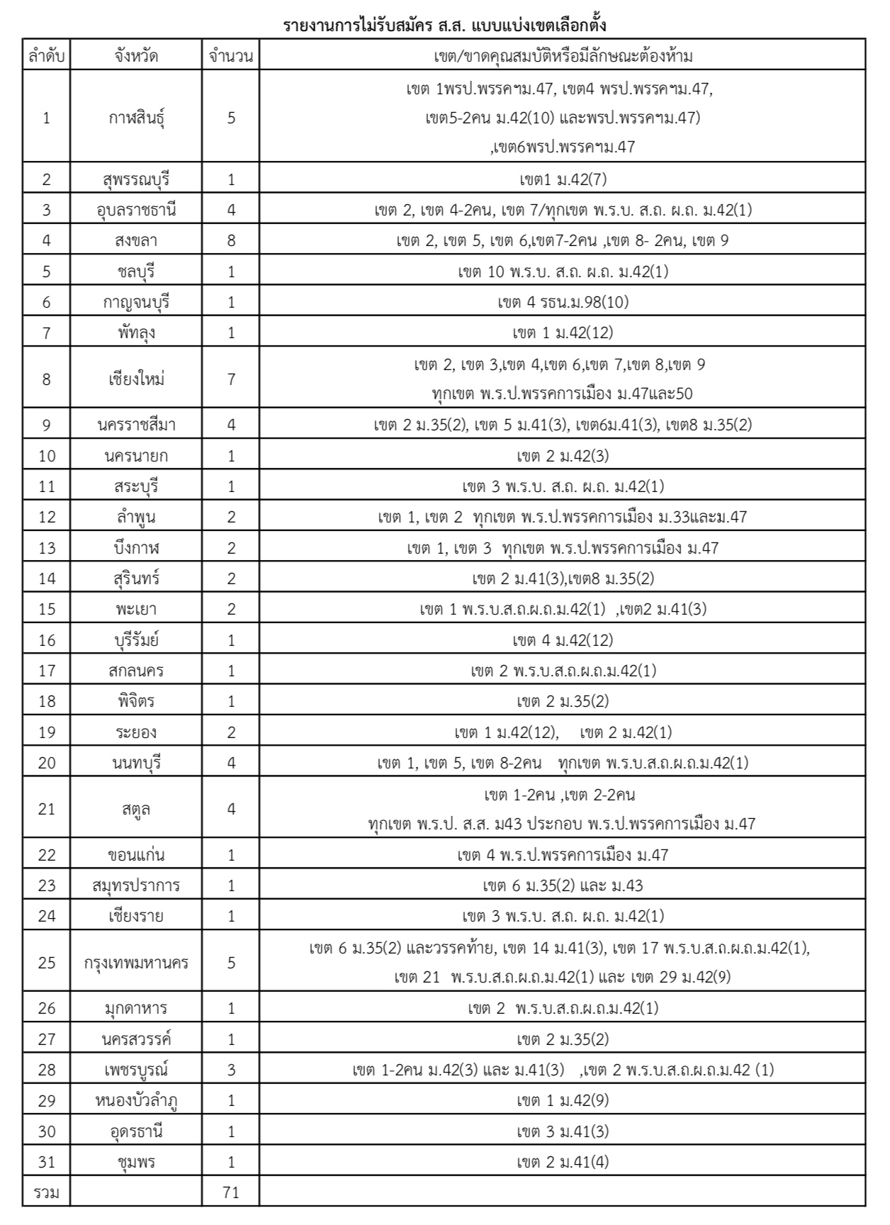 สำนักงานคณะกรรมการการเลือกตั้ง ประกาศรายชื่อผู้สมัครรับเลือกตั้งสมาชิกสภาผู้แทนราษฎรแบบแบ่งเขตเลือกตั้ง โดยมีผู้สมัครที่ไม่ประกาศรับรอง 71 คน