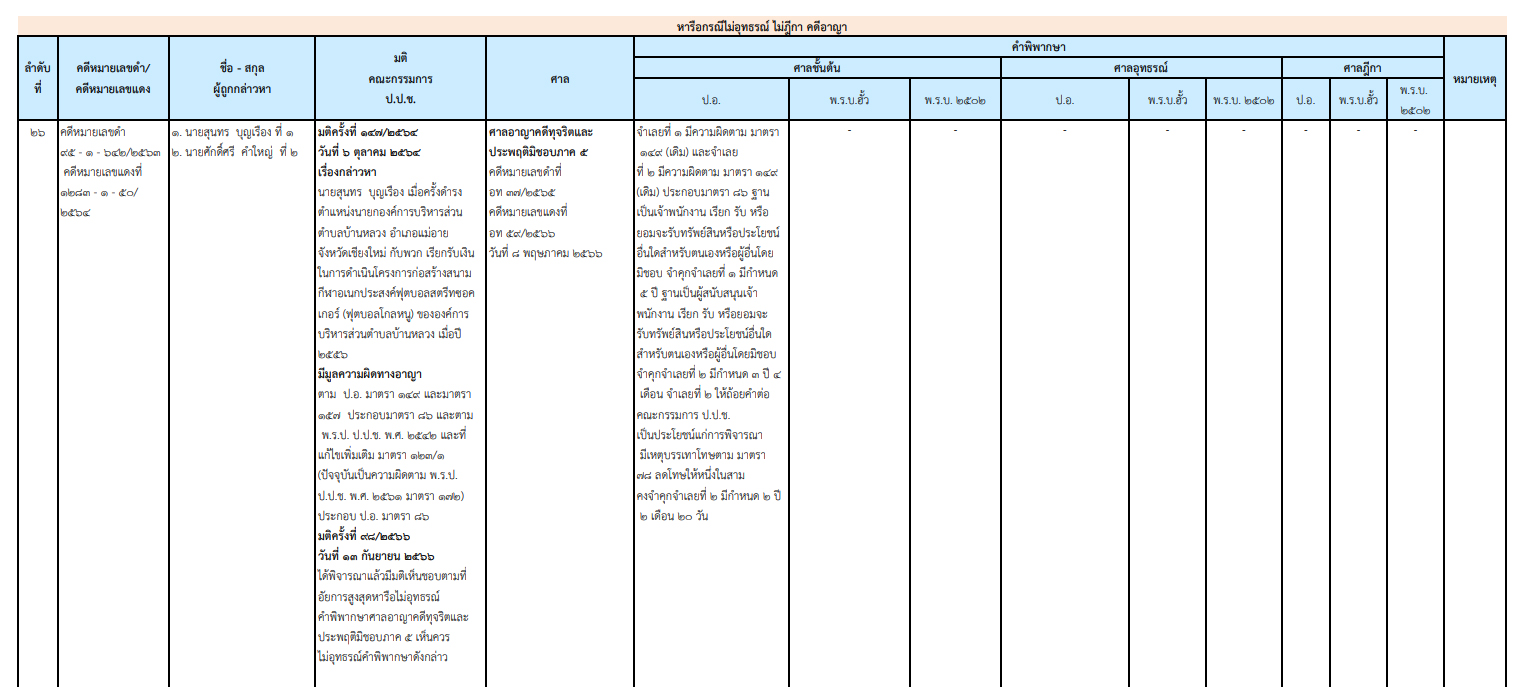 ป.ป.ช.เผยแพร่ความคืบหน้าผลคดีกล่าวหา 'สุนทร บุญเรือง' อดีตนายก อบต.บ้านหลวง เชียงใหม่ เรียกรับเงินโครงการสร้างสนามฟุตบอลโกลหนู ปี 56 ล่าสุด ศาลอาญาคดีทุจริตประพฤติมิชอบภาค 5 พิพากษาลงโทษจำคุก 5 ปี - พวก 1 ราย โดน 3 ปี 4 เดือน ให้การเป็นประโยชน์ลดโทษเหลือ 2 ปี 2 เดือน 20 วัน ไม่รอลงอาญา