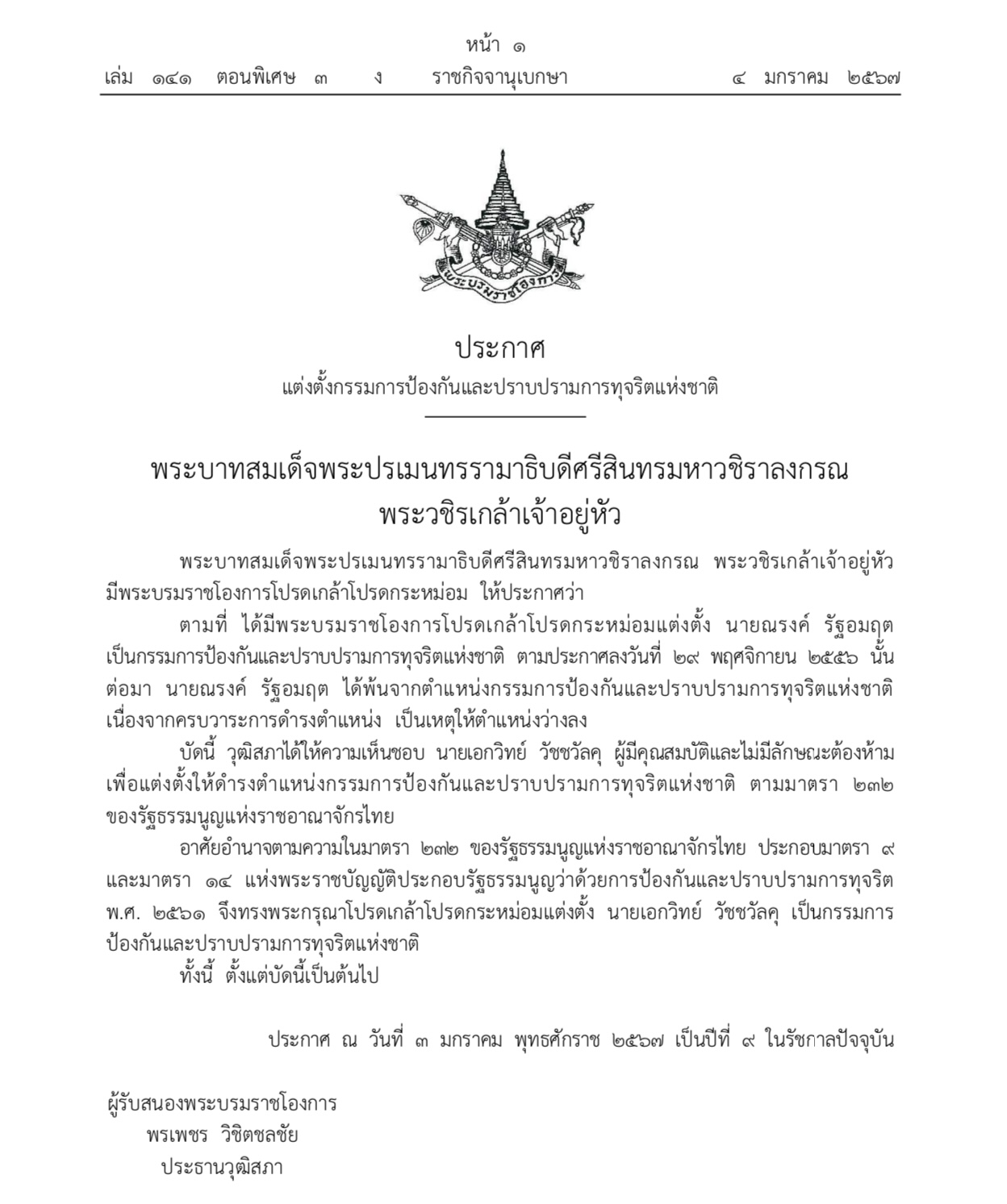 จึงทรงพระกรุณาโปรดเกล้าโปรดกระหม่อมแต่งตั้ง นายเอกวิทย์ วัชชวัลคุ เป็นกรรมการป้องกันและปราบปรามการทุจริตแห่งชาติ