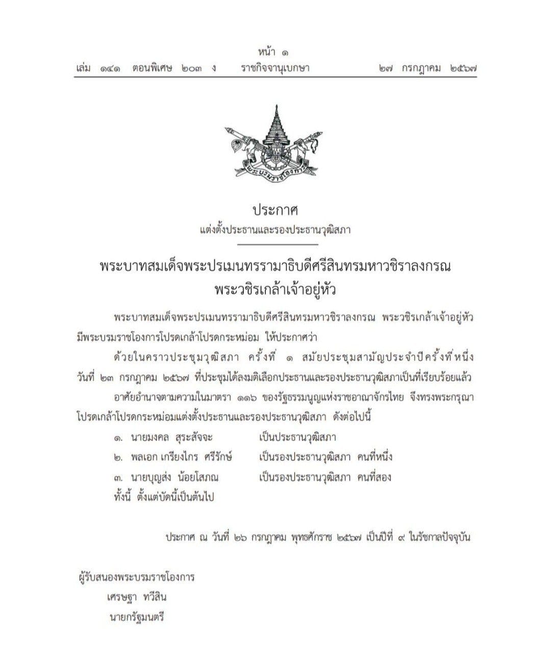 วันที่ 27 กรกฎาคม 2567 ราชกิจจานุเบกษาเผยแพร่ประกาศแต่งตั้งประธานและรองประธานวุฒิสภา ความว่า พระบาทสมเด็จพระปรเมนทรรามาธิบดีศรีสินทรมหาวชิราลงกรณ พระวชิรเกล้าเจ้าอยู่หัว มีพระบรมราชโองการโปรดเกล้าโปรดกระหม่อม ให้ประกาศว่า ด้วยในคราวประชุมวุฒิสภา ครั้งที่ 1 สมัยประชุมสามัญประจำปีครั้งที่หนึ่ง วันที่ 23 กรกฎาคม 2567 ที่ประชุมได้ลงมติเลือกประธานและรองประธานวุฒิสภาเป็นที่เรียบร้อยแล้ว อาศัยอำนาจตามความใน มาตรา 116 ของรัฐธรรมนูญแห่งราชอาณาจักรไทย จึงทรงพระกรุณาโปรดเกล้าโปรดกระหม่อมแต่งตั้งประธานและรองประธานวุฒิสภา ดังต่อไปนี้ นายมงคล สุระสัจจะ เป็นประธานวุฒิสภา พลเอก เกรียงไกร ศรีรักษ์ เป็นรองประธานวุฒิสภา คนที่หนึ่ง และนายบุญส่ง น้อยโสภณ เป็นรองประธานวุฒิสภา คนที่สอง ทั้งนี้ ตั้งแต่บัดนี้เป็นต้นไป ประกาศ ณ วันที่ 26 กรกฎาคม พุทธศักราช 2567 เป็นปีที่ 9 ในรัชกาลปัจจุบัน ผู้รับสนองพระบรมราชโองการ เศรษฐา ทวีสิน นายกรัฐมนตรี