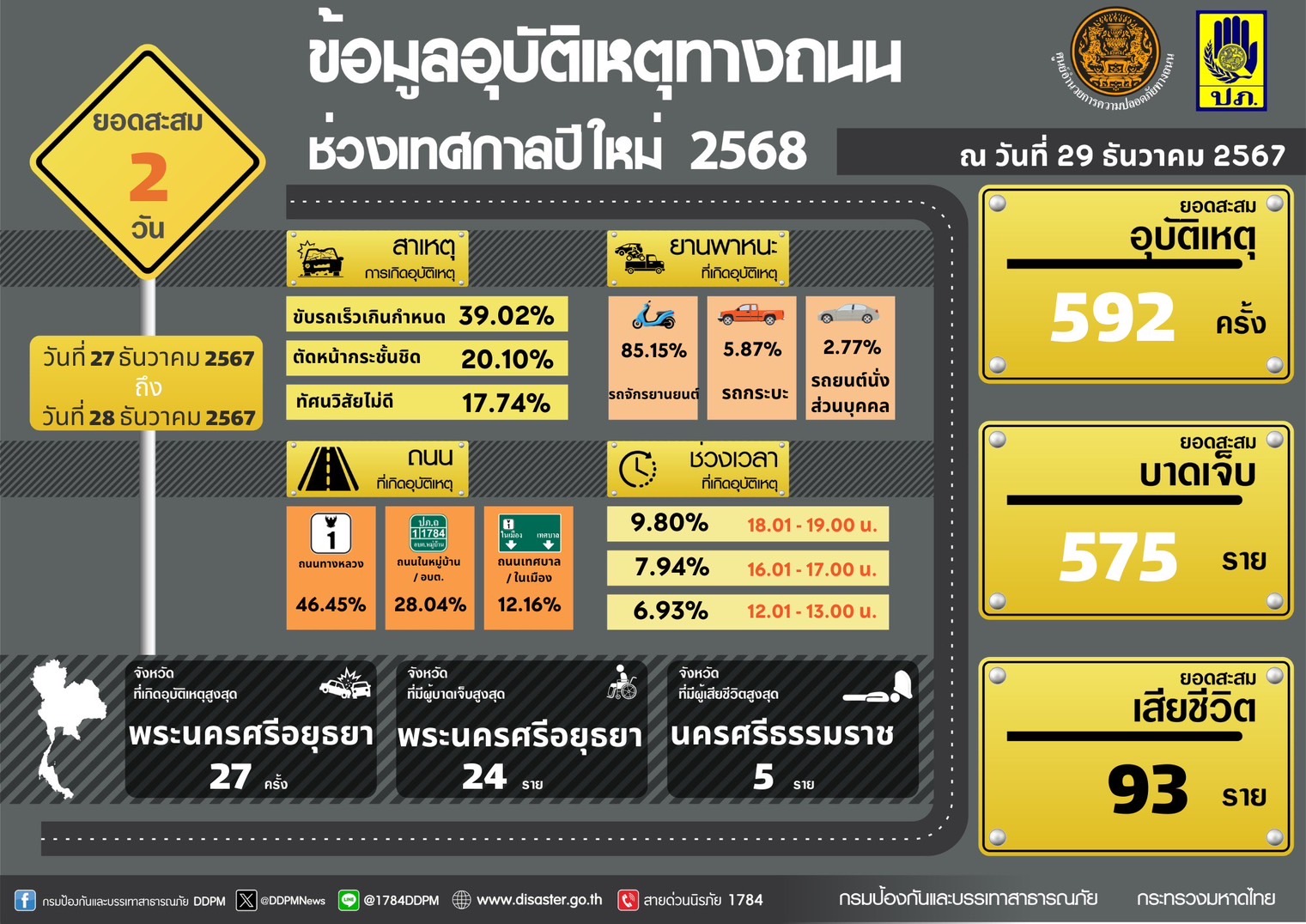 สำหรับข้อมูลอุบัติเหตุทางถนนช่วงเทศกาลปีใหม่ 2568 ประจำวันที่ 28 ธันวาคม 2567 ซึ่งเป็นวันที่สองของการรณรงค์ “ขับขี่ปลอดภัย เมืองไทยไร้อุบัติเหตุ” ศูนย์อำนวยการป้องกันและลดอุบัติเหตุทางถนนช่วงเทศกาลปีใหม่ พ.ศ. 2568 โดยกรมป้องกันและบรรเทาสาธารณภัยและความร่วมมือของหน่วยงานภาคีเครือข่ายได้รวบรวมสถิติอุบัติเหตุทางถนนประจำวันที่ 28 ธันวาคม 2567 เกิดอุบัติเหตุ 269 ครั้ง ผู้บาดเจ็บ 257 คน ผู้เสียชีวิต 38 ราย สาเหตุที่ทำให้เกิดอุบัติเหตุสูงสุด ได้แก่ ขับรถเร็ว ร้อยละ 38.29 ทัศนวิสัยไม่ดี ร้อยละ 21.56 ตัดหน้ากระชั้นชิด ร้อยละ 19.33 ยานพาหนะที่เกิดอุบัติเหตุสูงสุด ได้แก่ รถจักรยานยนต์ ร้อยละ 85.40 ส่วนใหญ่เกิดบนเส้นทางตรง ร้อยละ 86.25 ถนนกรมทางหลวง ร้อยละ 44.98 ถนนใน อบต./หมู่บ้าน ร้อยละ 28.25 ช่วงเวลาที่เกิดอุบัติเหตุสูงสุด ได้แก่ เวลา 18.01 – 19.00 น. ร้อยละ 11.90 ผู้บาดเจ็บและเสียชีวิตสูงสุดอยู่ในช่วงอายุ 40-49 ปี ร้อยละ 15.93 จัดตั้งจุดตรวจหลัก 1,770 จุด เจ้าหน้าที่ปฏิบัติงาน 50,835 คน โดยจังหวัดที่เกิดอุบัติเหตุสูงสุด ได้แก่ พระนครศรีอยุธยา และเชียงราย (จังหวัดละ 13 ครั้ง) จังหวัดที่มีผู้บาดเจ็บสูงสุด ได้แก่ เชียงราย (13 คน) จังหวัดที่มีผู้เสียชีวิตสูงสุด ได้แก่ พังงา และหนองบัวลำภู (จังหวัดละ 3 ราย) สรุปอุบัติเหตุทางถนนสะสมในช่วง 2 วันของการรณรงค์ (27 – 28 ธันวาคม 2567) เกิดอุบัติเหตุรวม 592 ครั้ง ผู้บาดเจ็บรวม 575 คน ผู้เสียชีวิต รวม 93 ราย จังหวัดที่ไม่มีผู้เสียชีวิต (ตายเป็นศูนย์) มี 51 จังหวัด จังหวัดที่เกิดอุบัติเหตุสะสมสูงสุด ได้แก่ พระนครศรีอยุธยา (27 ครั้ง) จังหวัดที่มีผู้บาดเจ็บสะสมสูงสุด ได้แก่ พระนครศรีอยุธยา (24 คน) จังหวัดที่มีผู้เสียชีวิตสะสมสูงสุด ได้แก่ นครศรีธรรมราช (5 ราย)