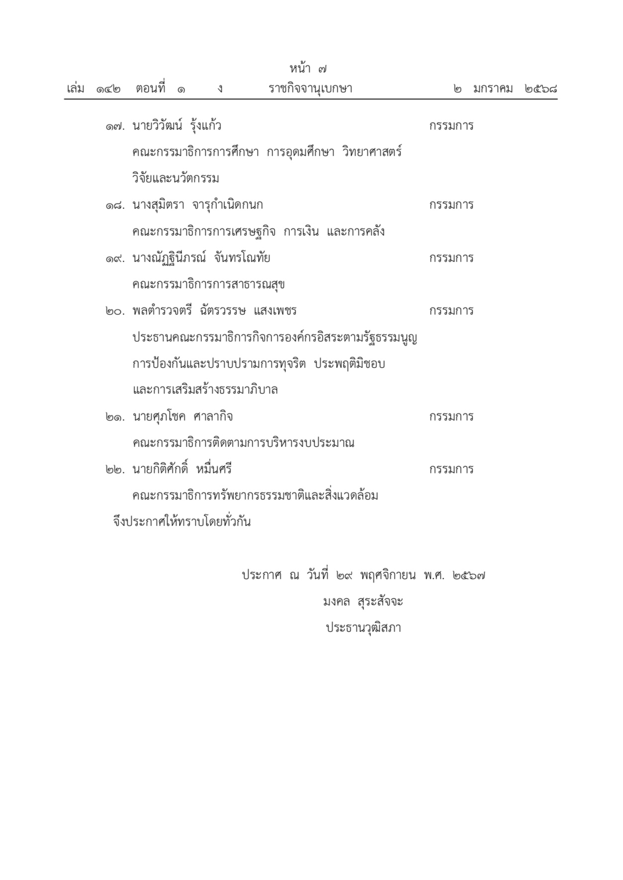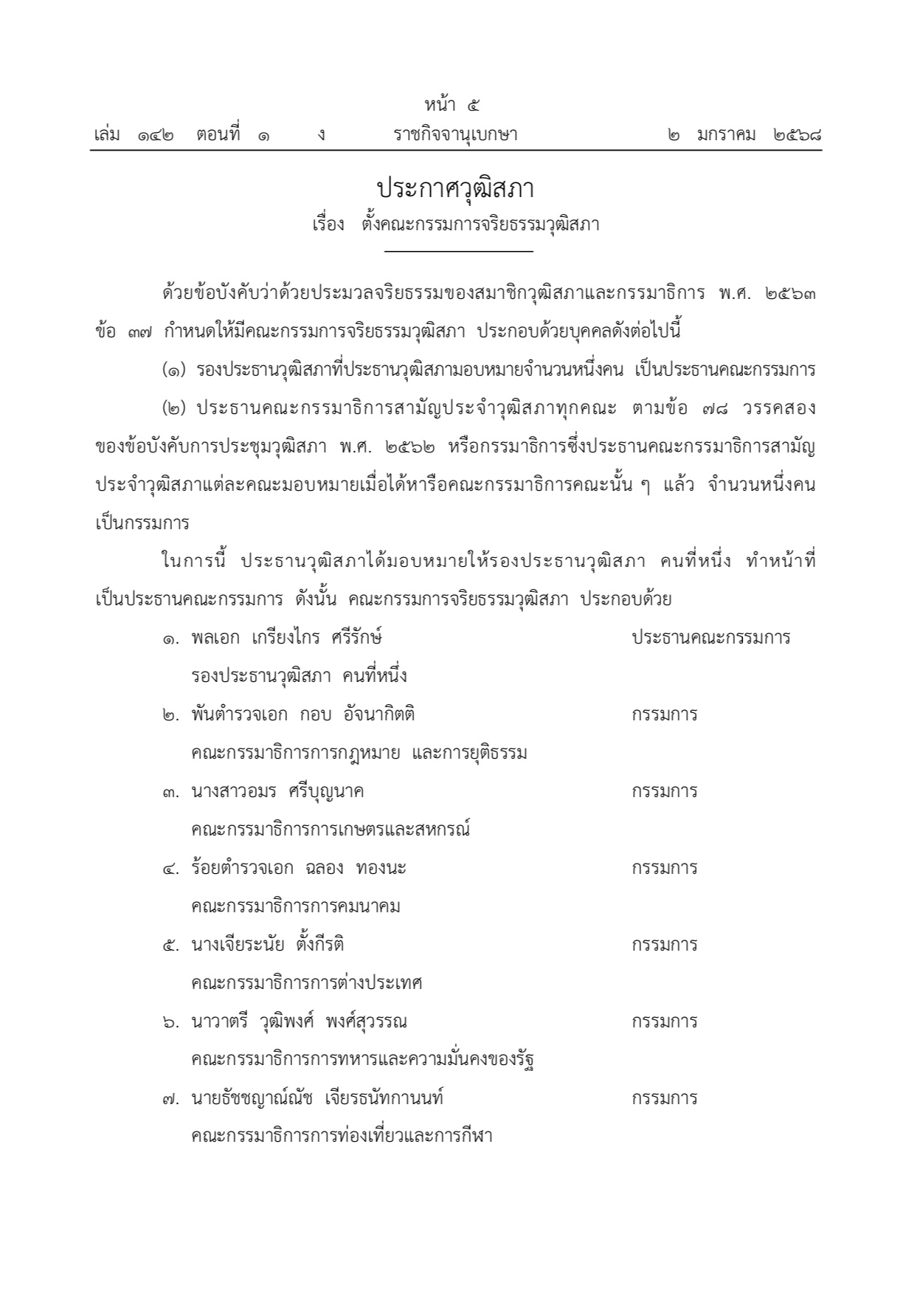 วันที่ 2 มกราคม 2568 เว็บไซต์ ราชกิจจานุเบกษา เผยแพร่ประกาศวุฒิสภา เรื่อง ตั้งคณะกรรมการจริยธรรมวุฒิสภา ความว่า ด้วยข้อบังคับว่าด้วยประมวลจริยธรรมของสมาชิกวุฒิสภาและกรรมาธิการ พ.ศ. 2563 ข้อ 37 กำหนดให้มีคณะกรรมการจริยธรรมวุฒิสภา ประกอบด้วยบุคคลดังต่อไปนี้