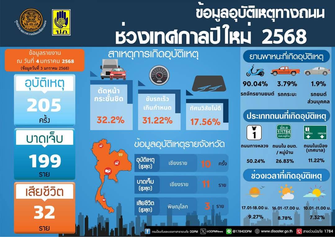 สำหรับข้อมูลอุบัติเหตุทางถนนช่วงเทศกาลปีใหม่ 2568 ประจำวันที่ 3 มกราคม 2568 ซึ่งเป็นวันที่แปดของการรณรงค์ “ขับขี่ปลอดภัย เมืองไทยไร้อุบัติเหตุ” ศูนย์อำนวยการป้องกันและลดอุบัติเหตุทางถนนช่วงเทศกาลปีใหม่ พ.ศ. 2568 โดยกรมป้องกันและบรรเทาสาธารณภัยและความร่วมมือของหน่วยงานภาคีเครือข่ายได้รวบรวมสถิติอุบัติเหตุทางถนนประจำวันที่ 3 มกราคม 2568 เกิดอุบัติเหตุ 205 ครั้ง ผู้บาดเจ็บ 199 คน ผู้เสียชีวิต 32 ราย สาเหตุที่ทำให้เกิดอุบัติเหตุสูงสุด ได้แก่ ตัดหน้ากระชั้นชิด ร้อยละ 32.2 ขับรถเร็ว ร้อยละ 31.22 และทัศนวิสัยไม่ดี ร้อยละ 17.56 ยานพาหนะที่เกิดอุบัติเหตุสูงสุด ได้แก่ รถจักรยานยนต์ ร้อยละ 90.04 ส่วนใหญ่เกิดบนเส้นทางตรง ร้อยละ 84.39 ถนนกรมทางหลวง ร้อยละ 50.24 ถนนใน อบต./หมู่บ้าน ร้อยละ 26.83 ช่วงเวลาที่เกิดอุบัติเหตุสูงสุด ได้แก่ เวลา 17.01-18.00 น. ร้อยละ 9.27 เวลา 16.01-17.00 น. ร้อยละ 8.78 และ เวลา 10.01-11.00 น. ร้อยละ 7.32 ผู้บาดเจ็บและเสียชีวิตสูงสุดอยู่ในช่วงอายุ 50-59 ปี ร้อยละ 15.58 จัดตั้งจุดตรวจหลัก 1,765 จุด เจ้าหน้าที่ปฏิบัติงาน 50,303 คน โดยจังหวัดที่เกิดอุบัติเหตุสูงสุด ได้แก่ เชียงราย (10 ครั้ง) จังหวัดที่มีผู้บาดเจ็บสูงสุด ได้แก่ เชียงราย (11 คน) จังหวัดที่มีผู้เสียชีวิตสูงสุด ได้แก่ พิษณุโลก (3 ราย)
