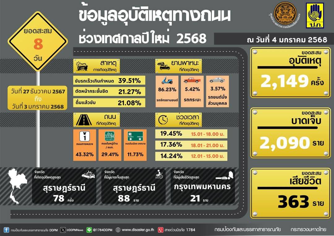สรุปอุบัติเหตุทางถนนสะสมในช่วง 8 วันของการรณรงค์ (27 ธันวาคม 2567 – 3 มกราคม 2568) เกิดอุบัติเหตุรวม 2,149 ครั้ง ผู้บาดเจ็บรวม 2,090 คน ผู้เสียชีวิต รวม 363 ราย จังหวัดที่ไม่มีผู้เสียชีวิต (ตายเป็นศูนย์) มี 4 จังหวัด ได้แก่ ตรังตราด ยะลา และสมุทรสงคราม จังหวัดที่เกิดอุบัติเหตุสะสมสูงสุด ได้แก่ สุราษฎร์ธานี (78 ครั้ง) จังหวัดที่มีผู้บาดเจ็บสะสมสูงสุด ได้แก่ สุราษฎร์ธานี (88 คน) จังหวัดที่มีผู้เสียชีวิตสะสมสูงสุด ได้แก่ กรุงเทพมหานคร (21 ราย)